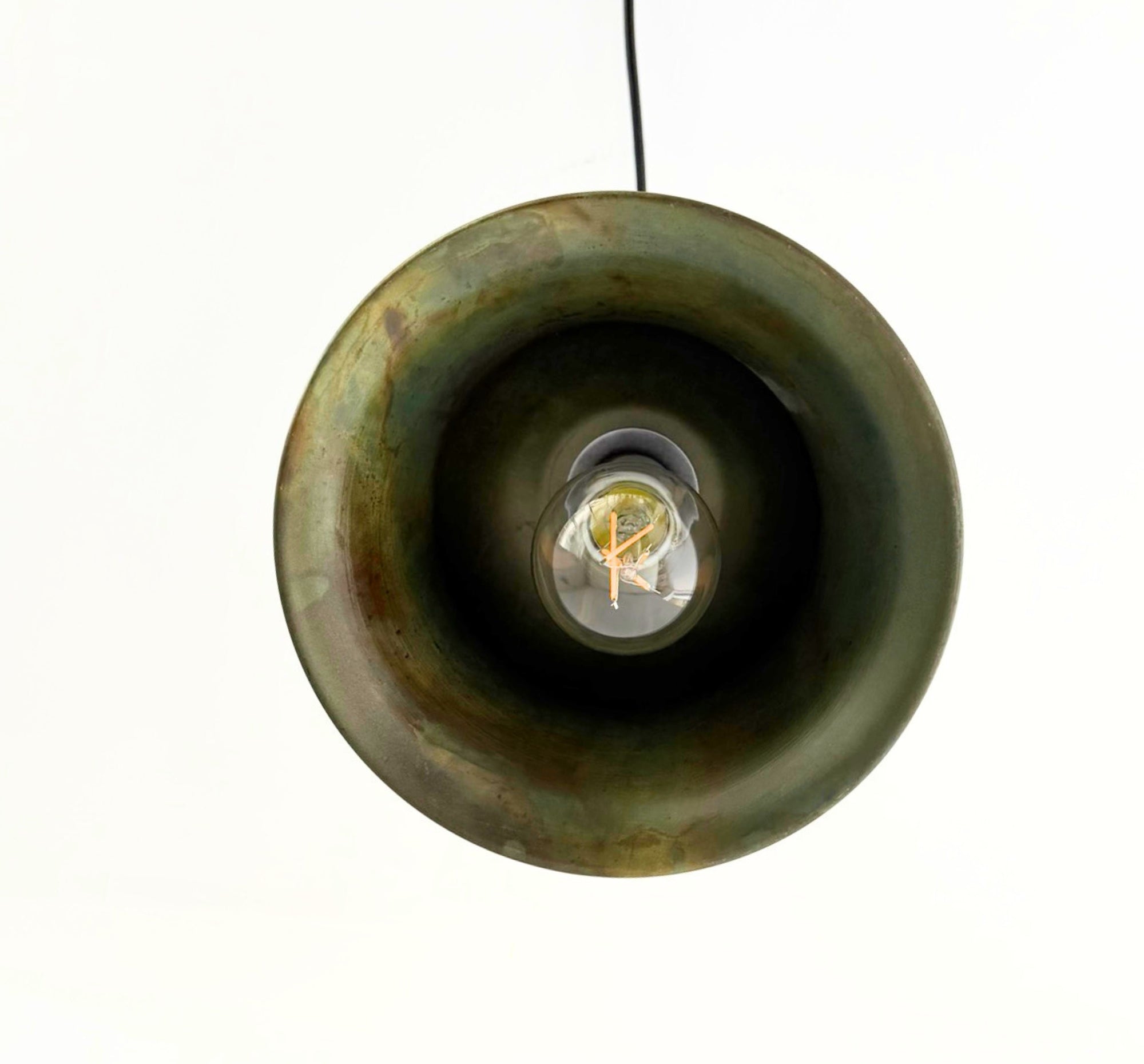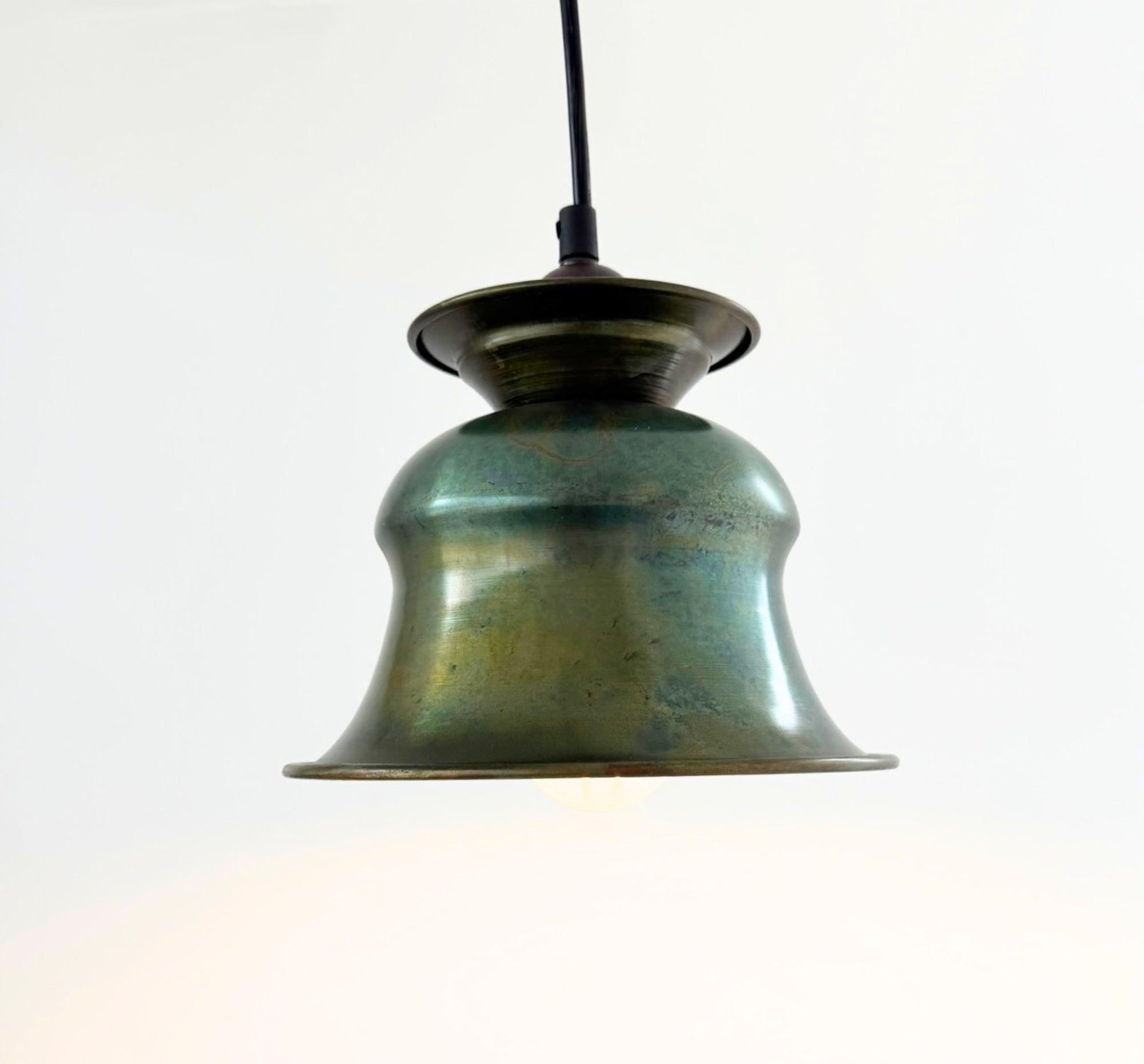 Its softly curved silhouette and rich patina detailing create depth and authenticity, while the open-bottom design allows for warm, downward illumination—perfect for kitchen islands, entryways, dining areas, or layered lighting in a cozy farmhouse interior. The aged finish develops natural tonal variation, making each pendant uniquely yours. Whether styled in a modern farmhouse, rustic cottage, industrial loft, or boutique hospitality setting, this piece adds understated elegance with vintage soul.