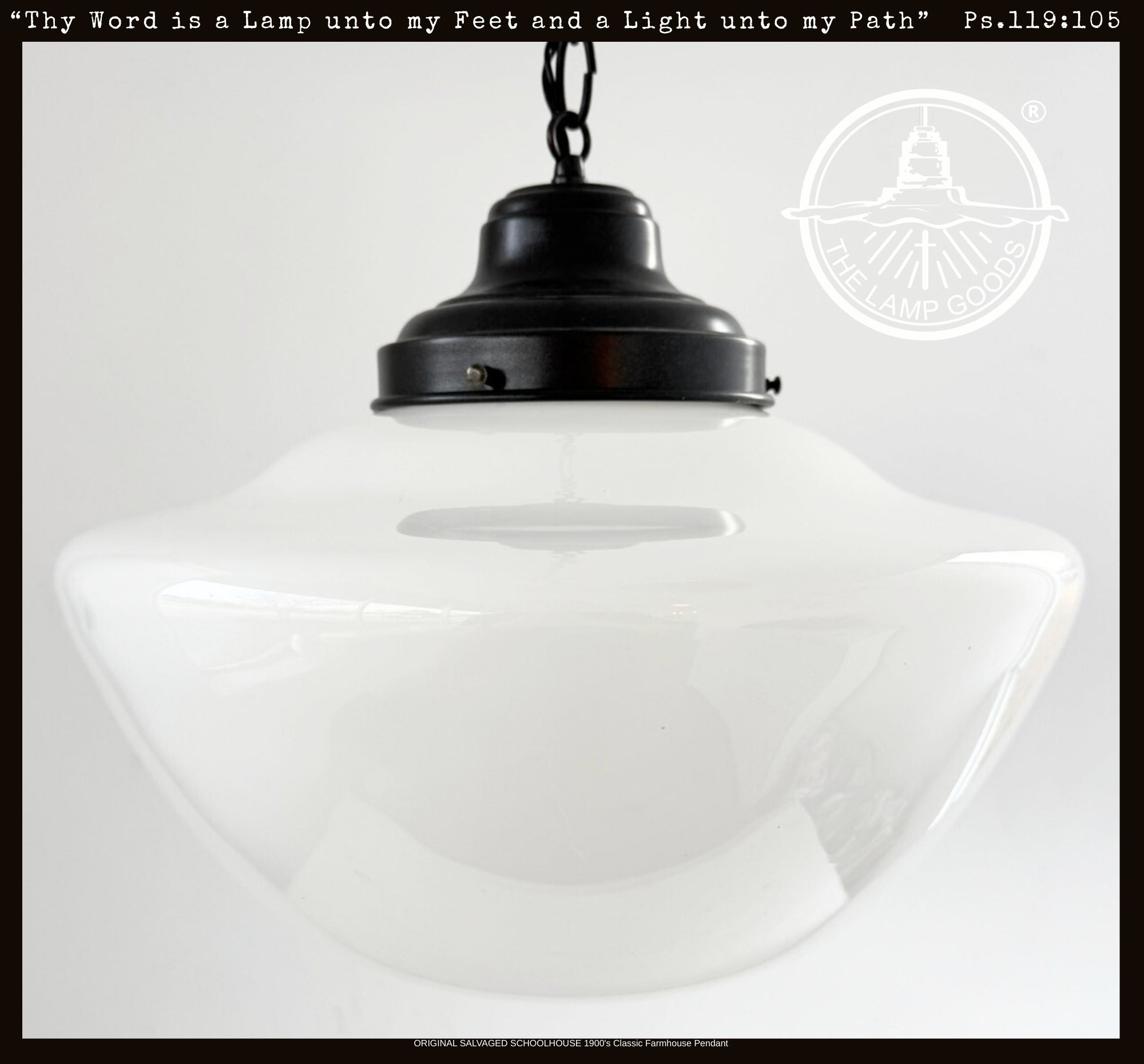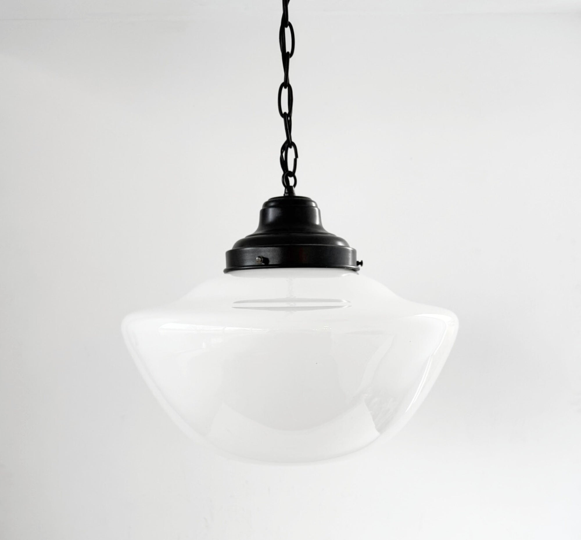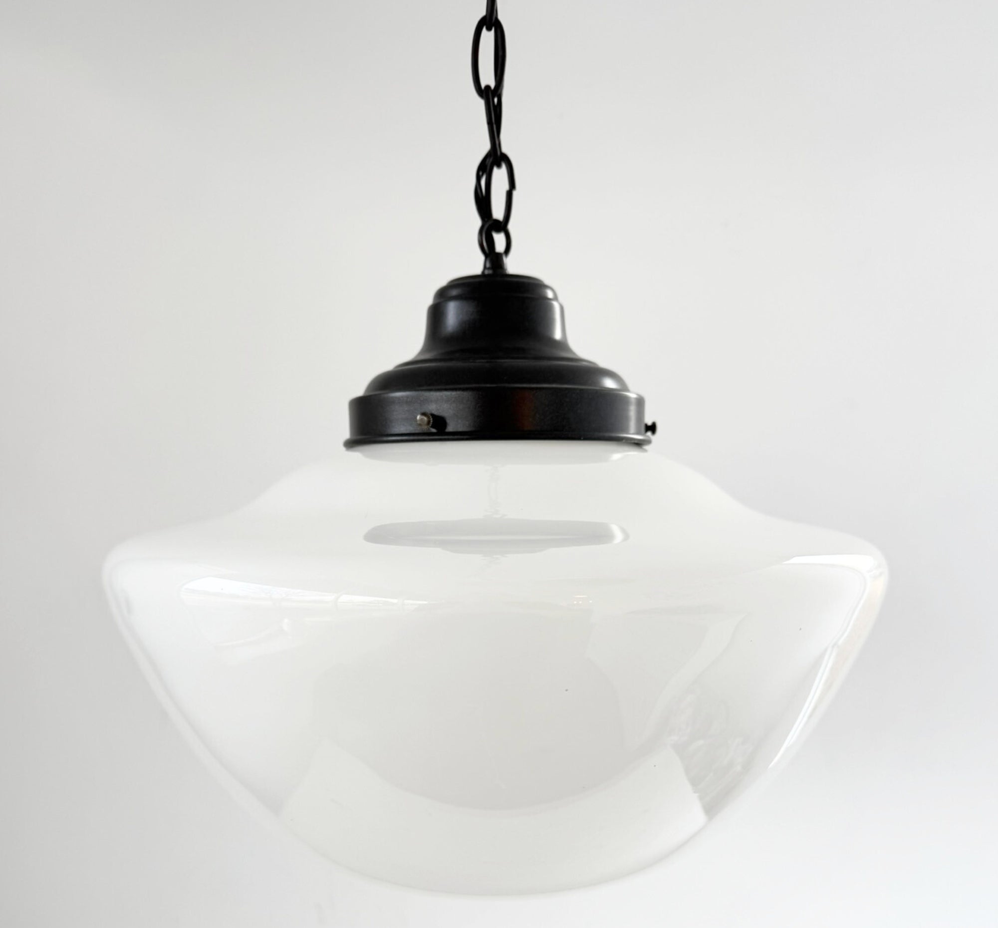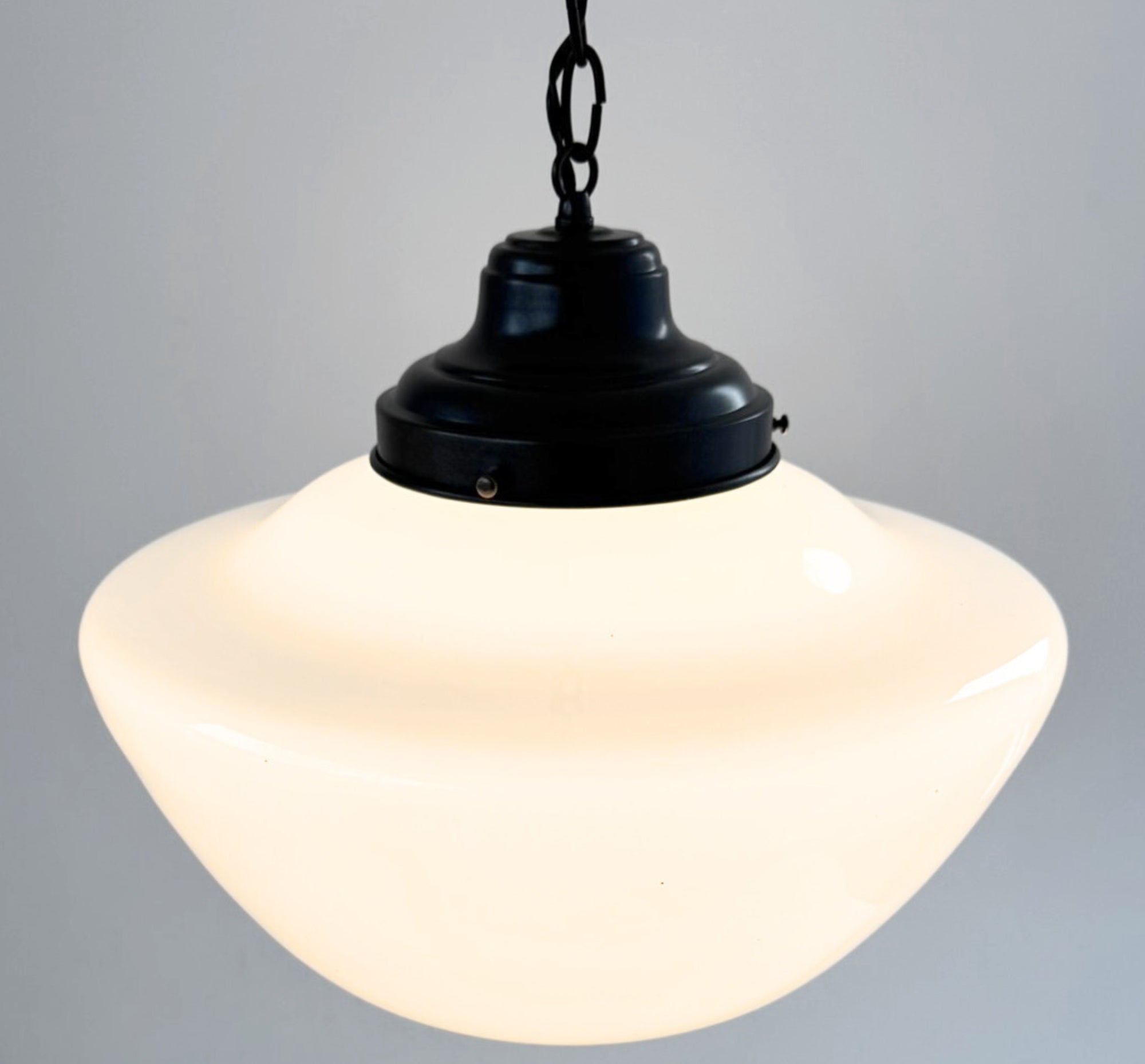 This stunning extra large schoolhouse pendant dates back to the 1920s and showcases the timeless beauty of classic American lighting design. Crafted from thick, high-quality milk glass, its generous scale and iconic schoolhouse silhouette make it a striking statement piece while still providing a soft, even glow.