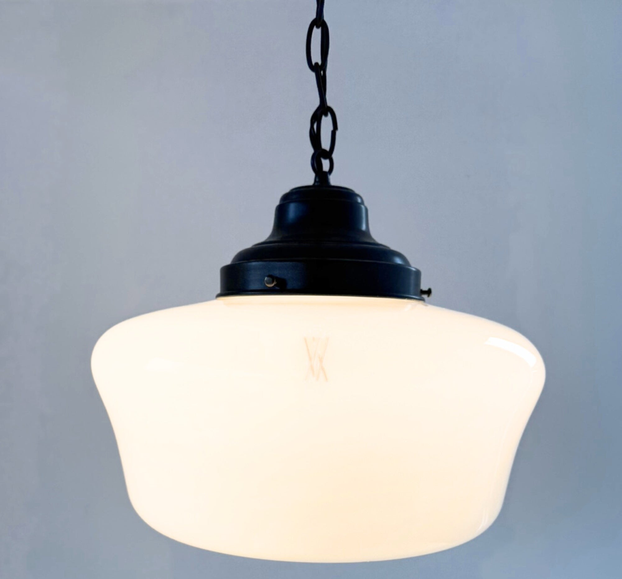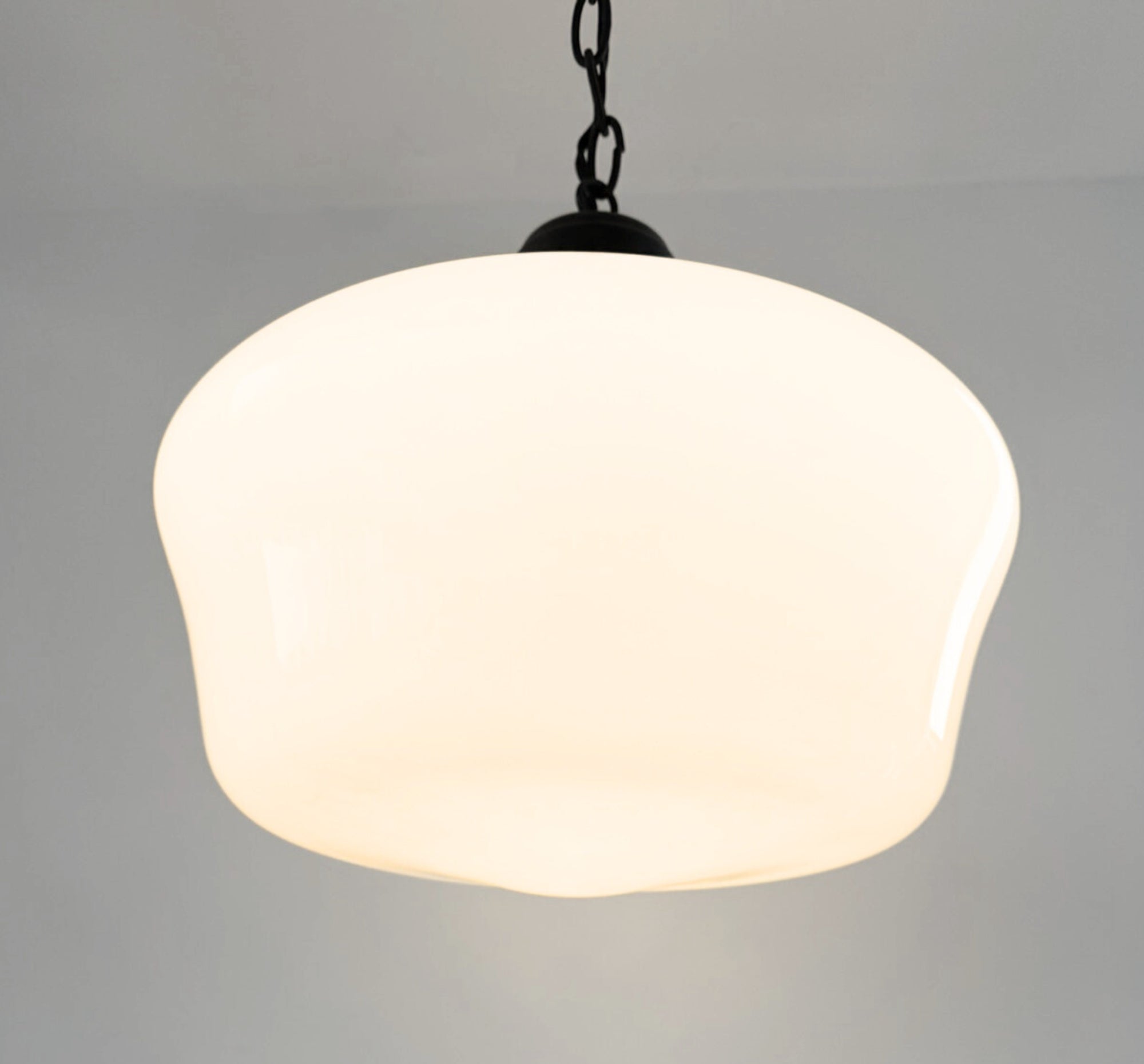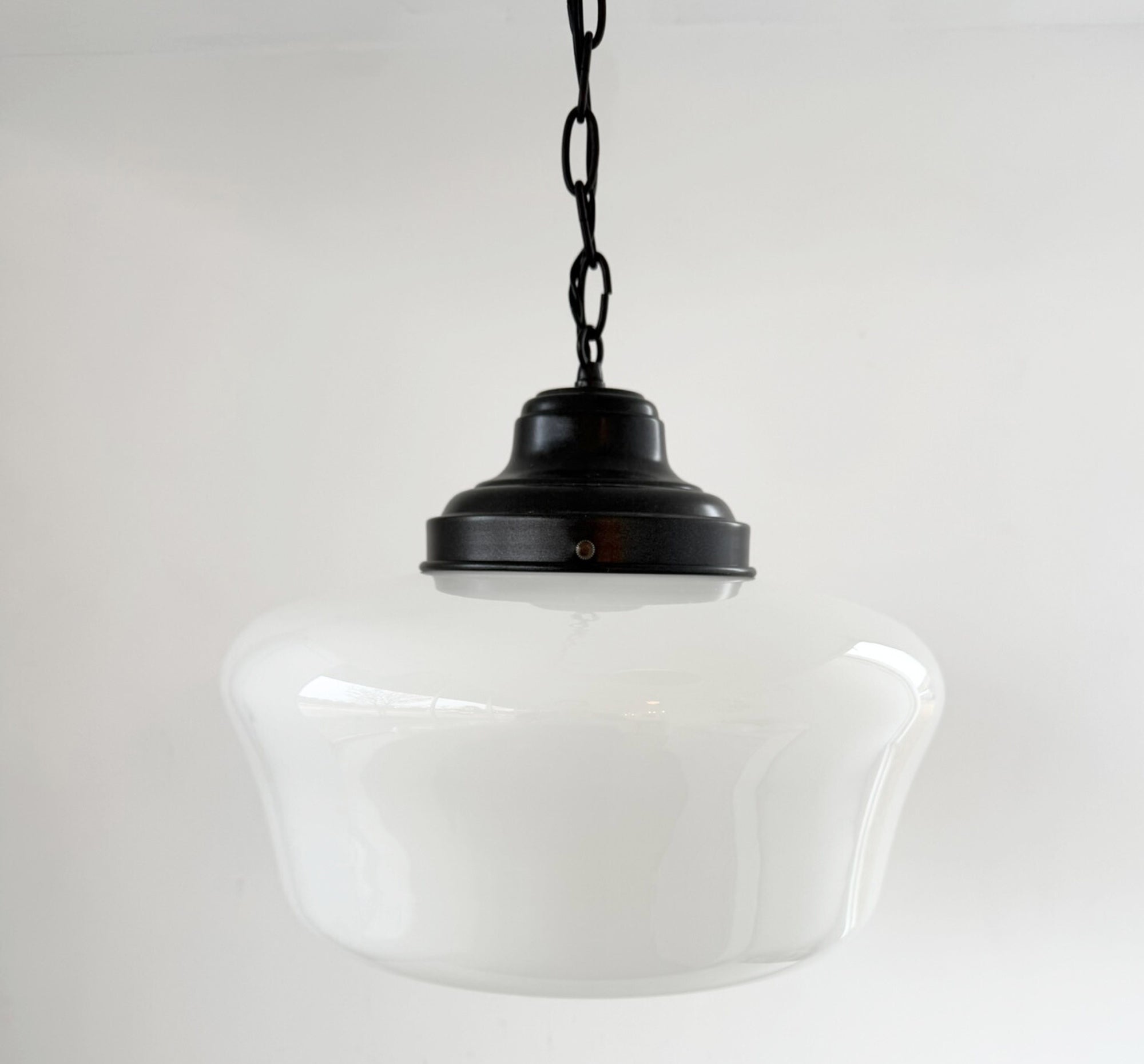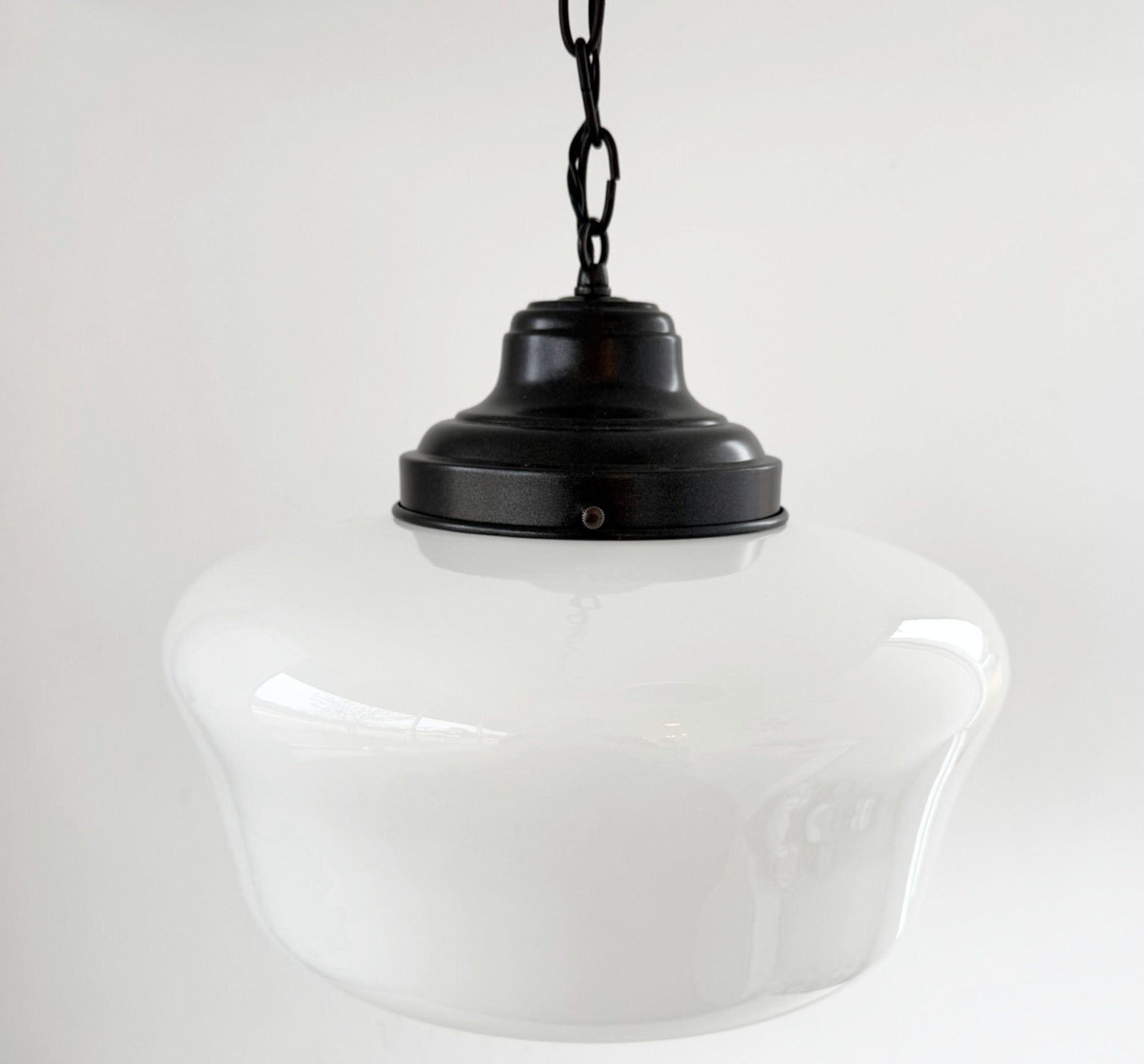 The Beveled Schoolhouse Milk Glass Pendant is a timeless lighting staple inspired by early American schoolhouse fixtures. Featuring a softly flared milk glass shade with a subtle beveled edge, this pendant delivers warm, evenly diffused light while adding quiet architectural detail to any space. This piece is an ORIGINAL schoolhouse globe from the early 1900's that was salvaged and brought back to life!