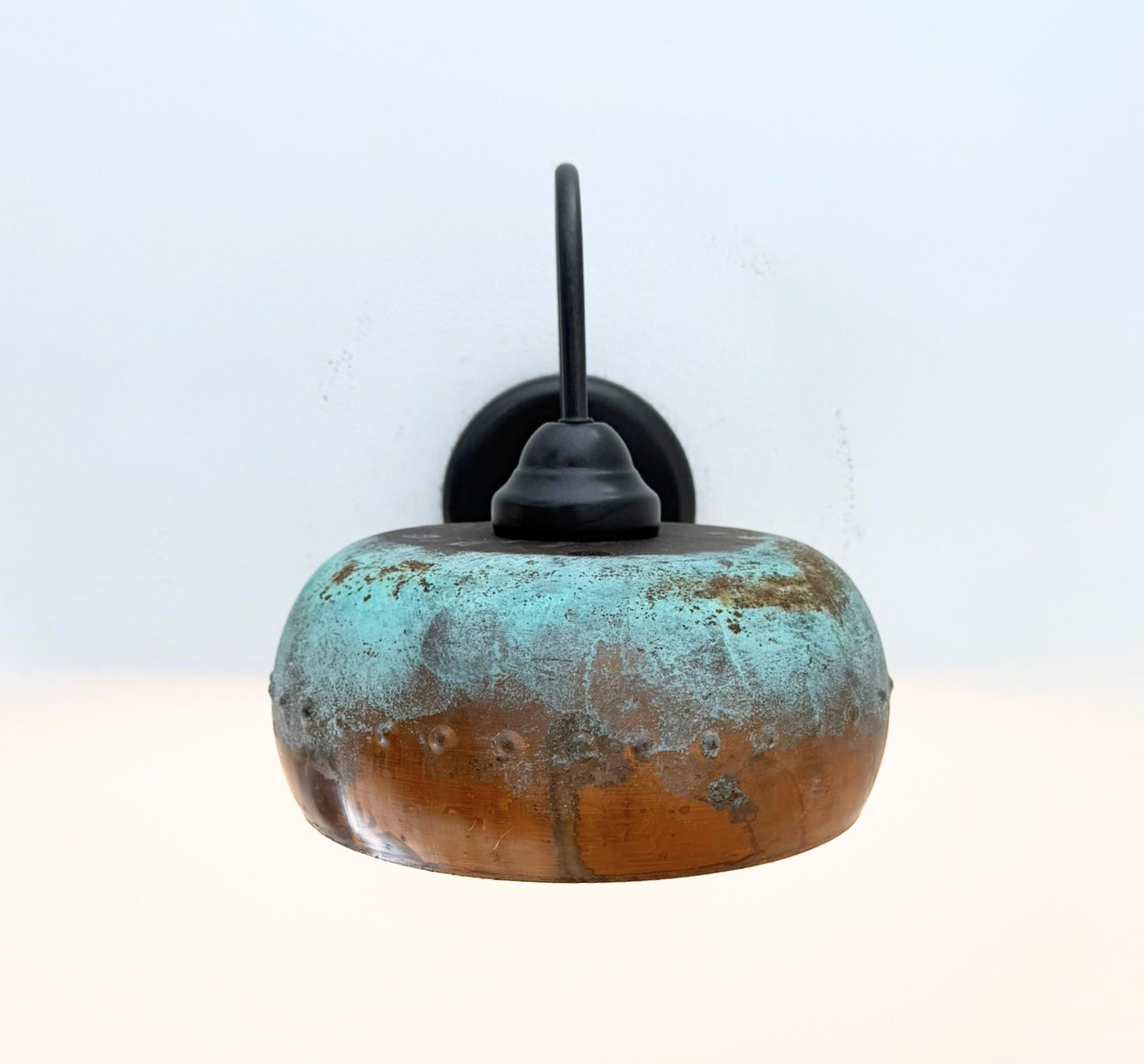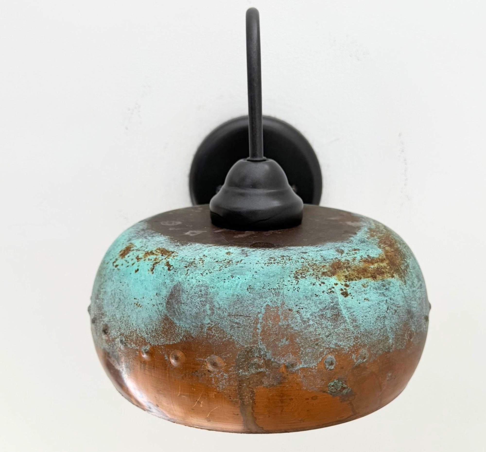 The aged copper finish develops beautiful tonal variation, creating depth and authenticity in every piece. When illuminated, the warm glow reflects off the copper interior, casting a soft ambient light that feels inviting and refined. Perfect for modern farmhouse homes, cozy cottages, rustic barns, and boutique hospitality spaces, this sconce makes a statement while remaining effortlessly versatile.