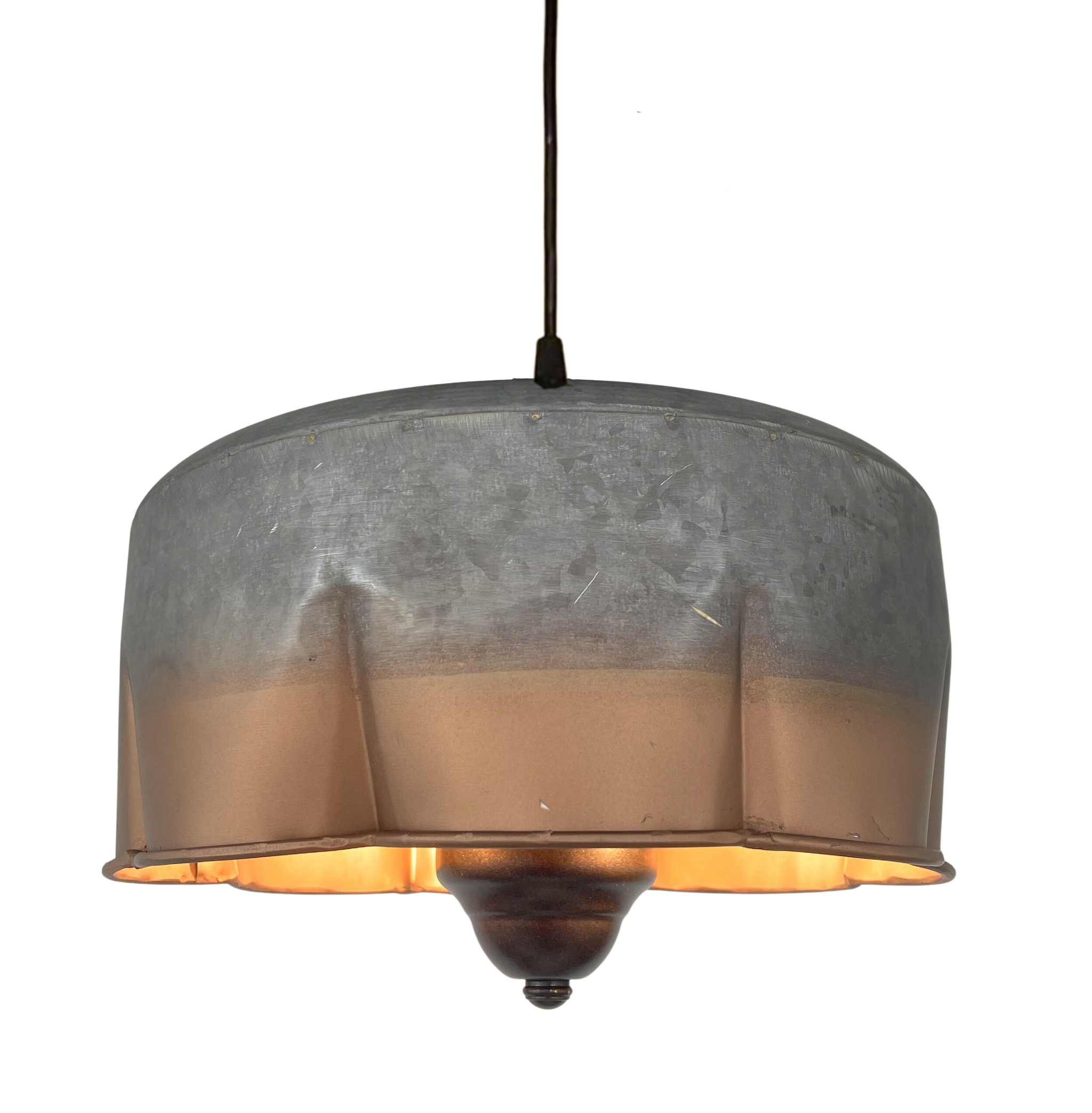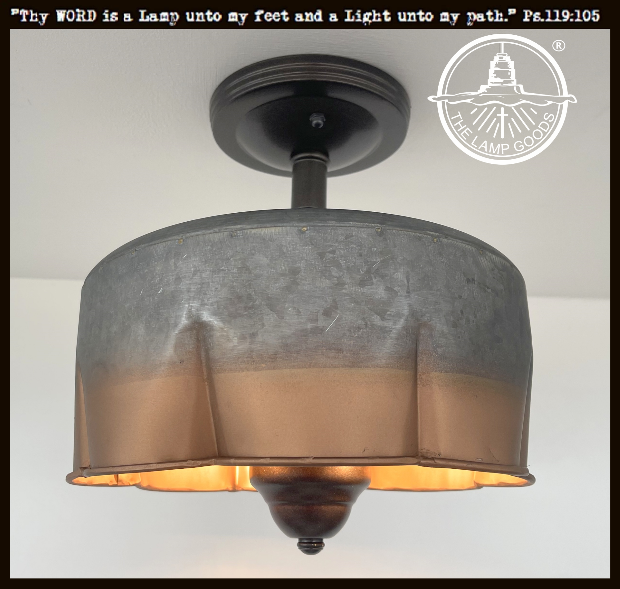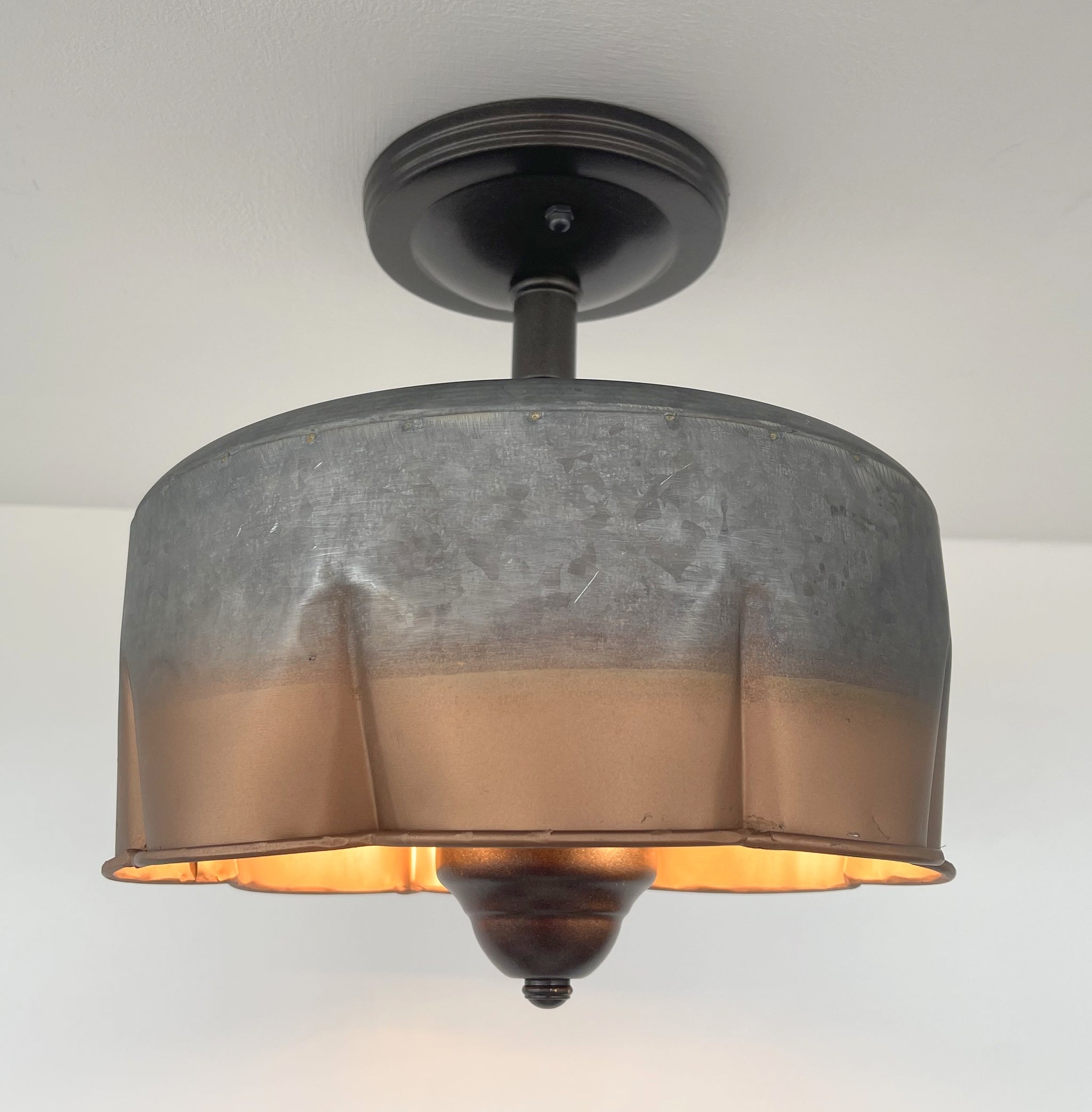 A handcrafted Galvanized Metal Ceiling Light with Copper Tone Accents, perfect for your rustic industrial style or your modern farmhouse kitchen lighting. The beautiful copper tone combined with the unique ruffled edge, this farmhouse flush mount ceiling light fixture will effortlessly become the focal point of your kitchen or dining room