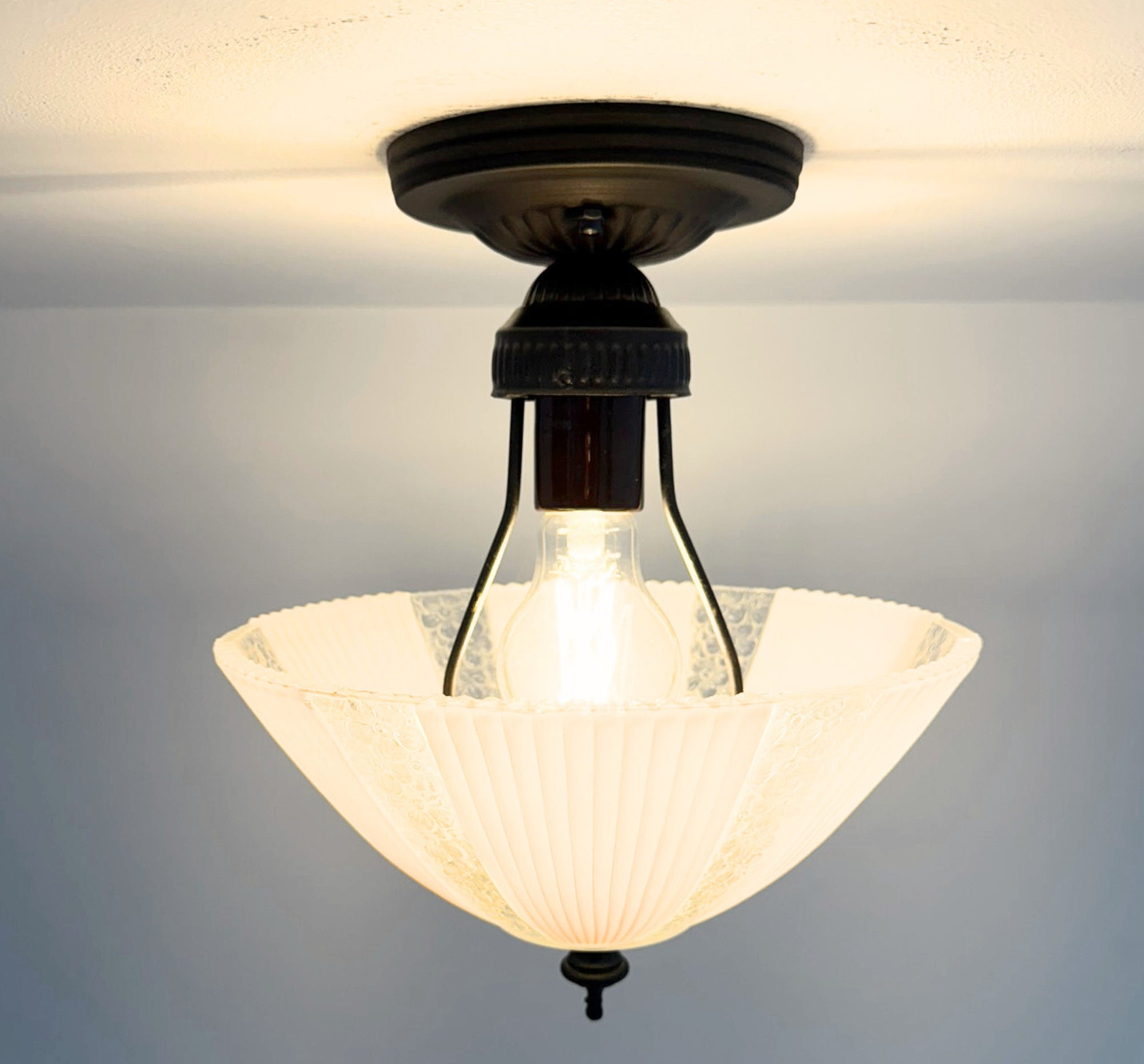 • 9" wide x 11" tall 1940’s Floral Panel Ribbed Glass Ceiling Fixture