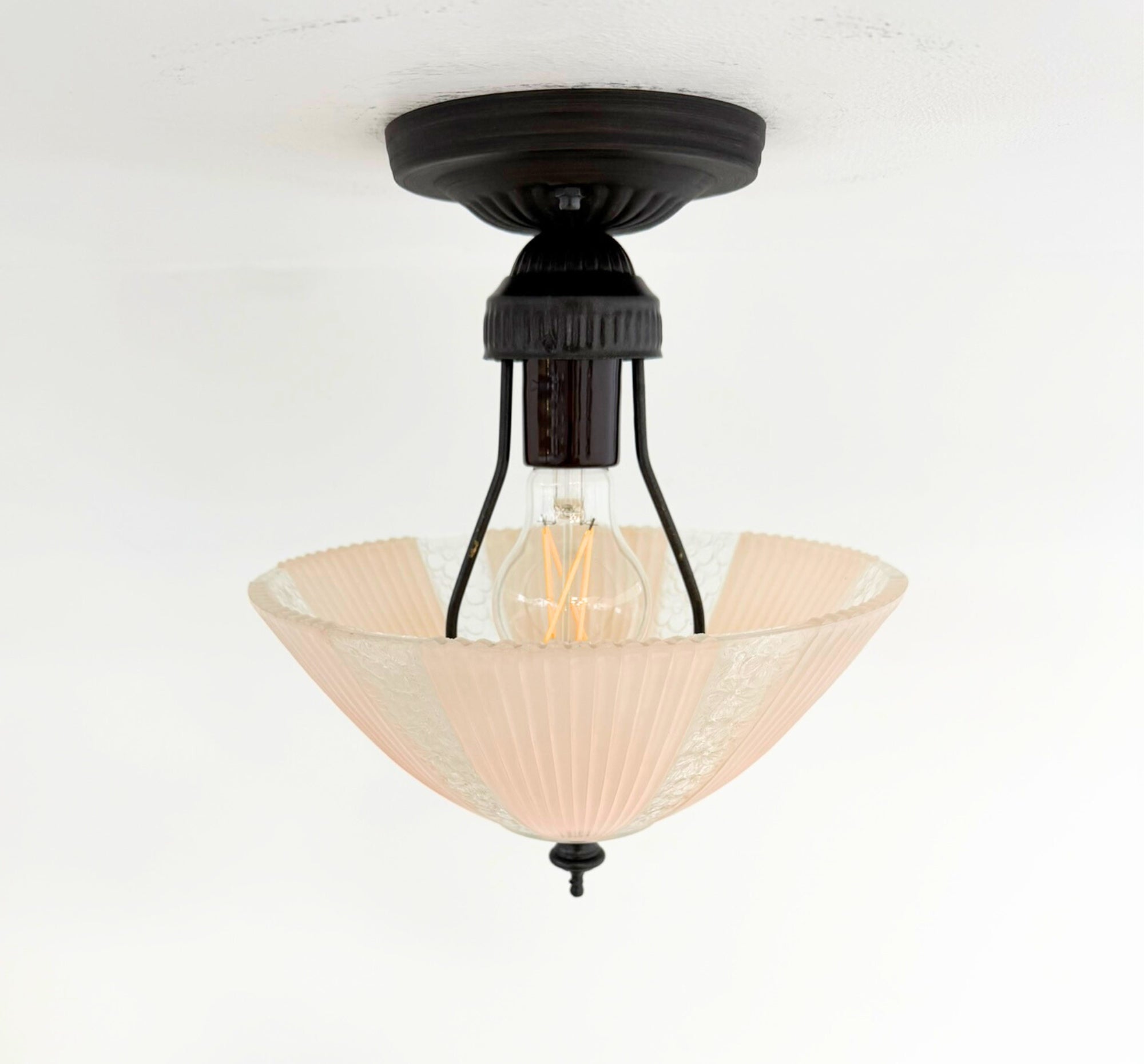 This elegant ceiling fixture dates to the 1940s and showcases a beautifully crafted ribbed glass shade with delicate floral panel detailing, a hallmark of the era’s refined yet approachable design. The softly blushed glass diffuses light gently, creating a warm, calming glow that feels timeless and inviting.