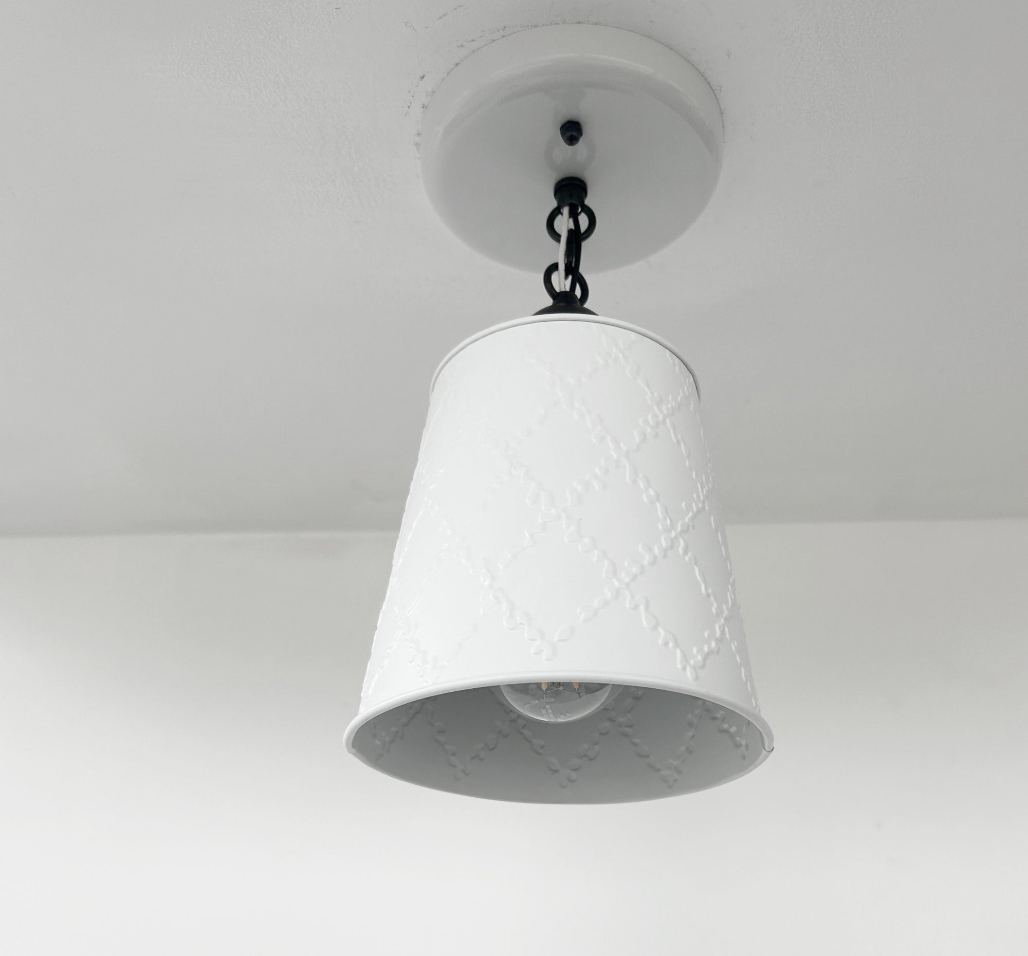 Brighten your home with clean farmhouse charm using our Embossed White Tin Farmhouse Ceiling Light. This handcrafted light features a beautifully detailed embossed tin shade with a soft white enamel finish, adding elegant texture and subtle pattern to any space. The dark metal chain and hardware provide just the right amount of contrast, giving the fixture a timeless modern farmhouse appeal.