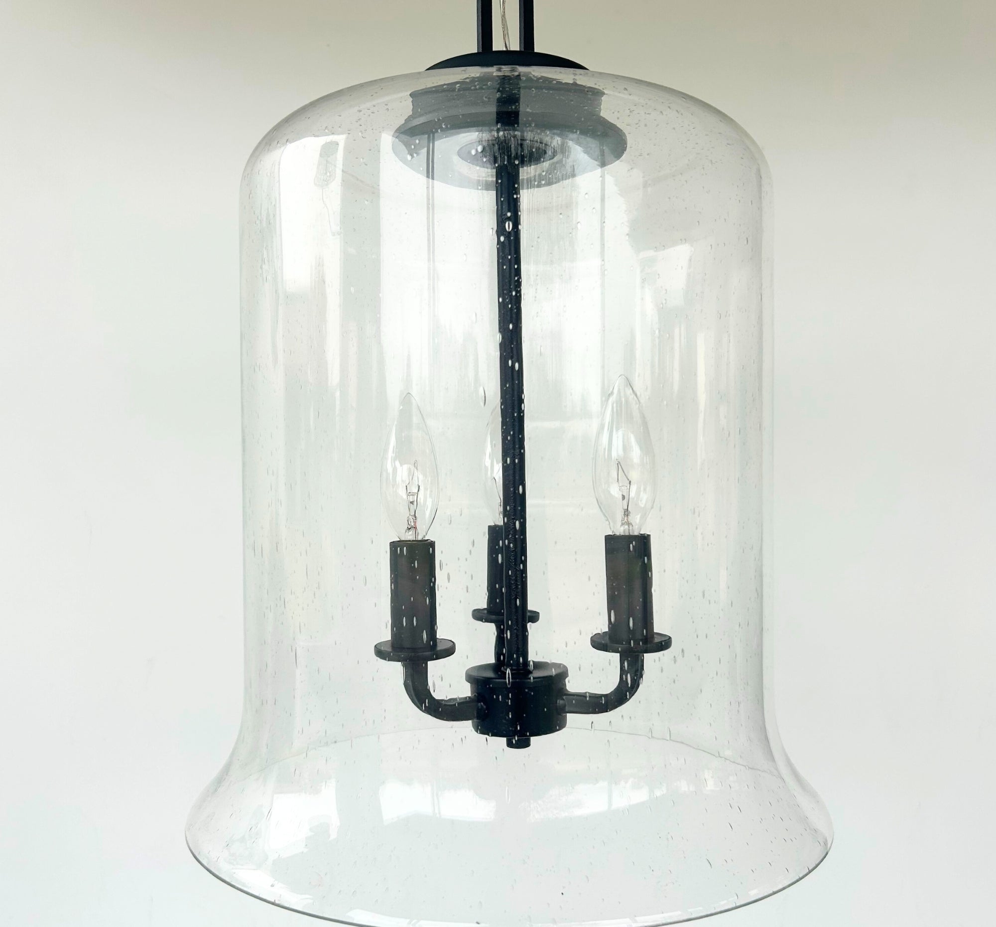 Add farmhouse elegance to your home with this Large Clear Seeded Glass Bell Pendant Light. The hand-blown glass shade and three-light candelabra design create a soft, glowing ambiance, perfect for kitchens, dining rooms, or entryways. With its timeless style and modern black finish, this pendant blends rustic warmth and sophistication.
