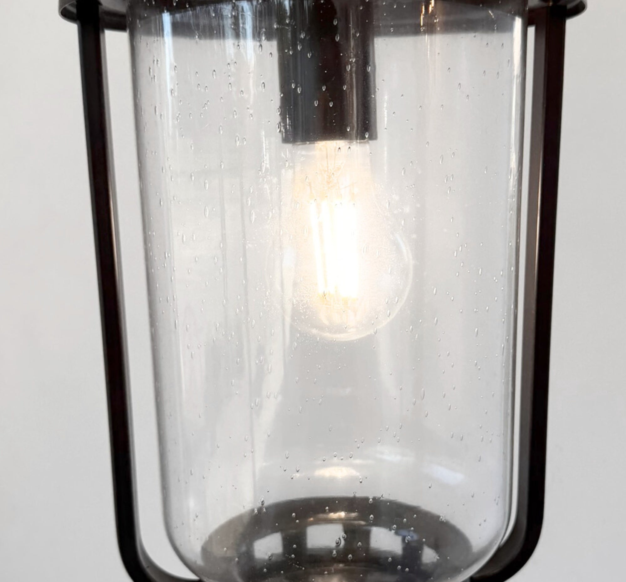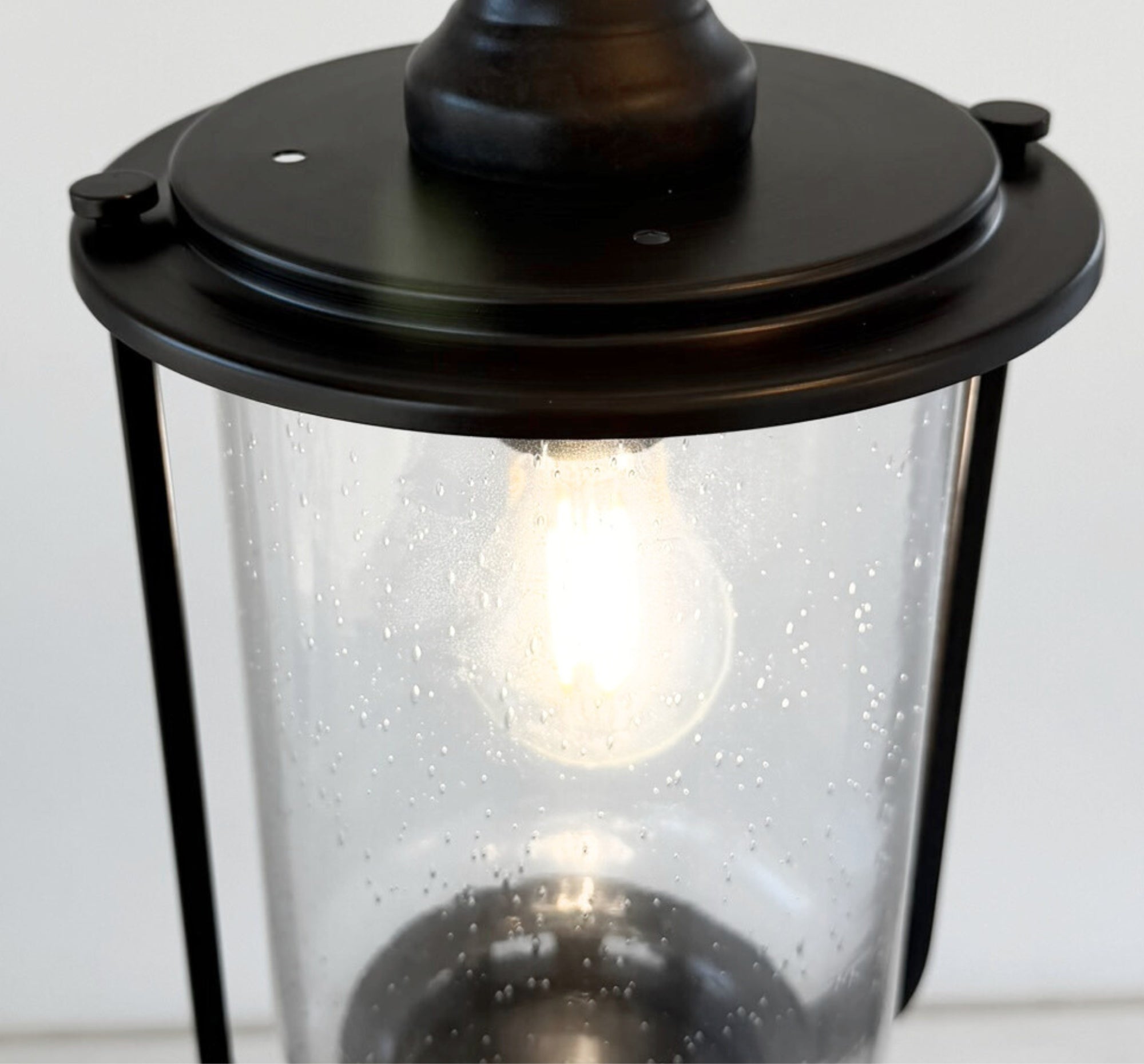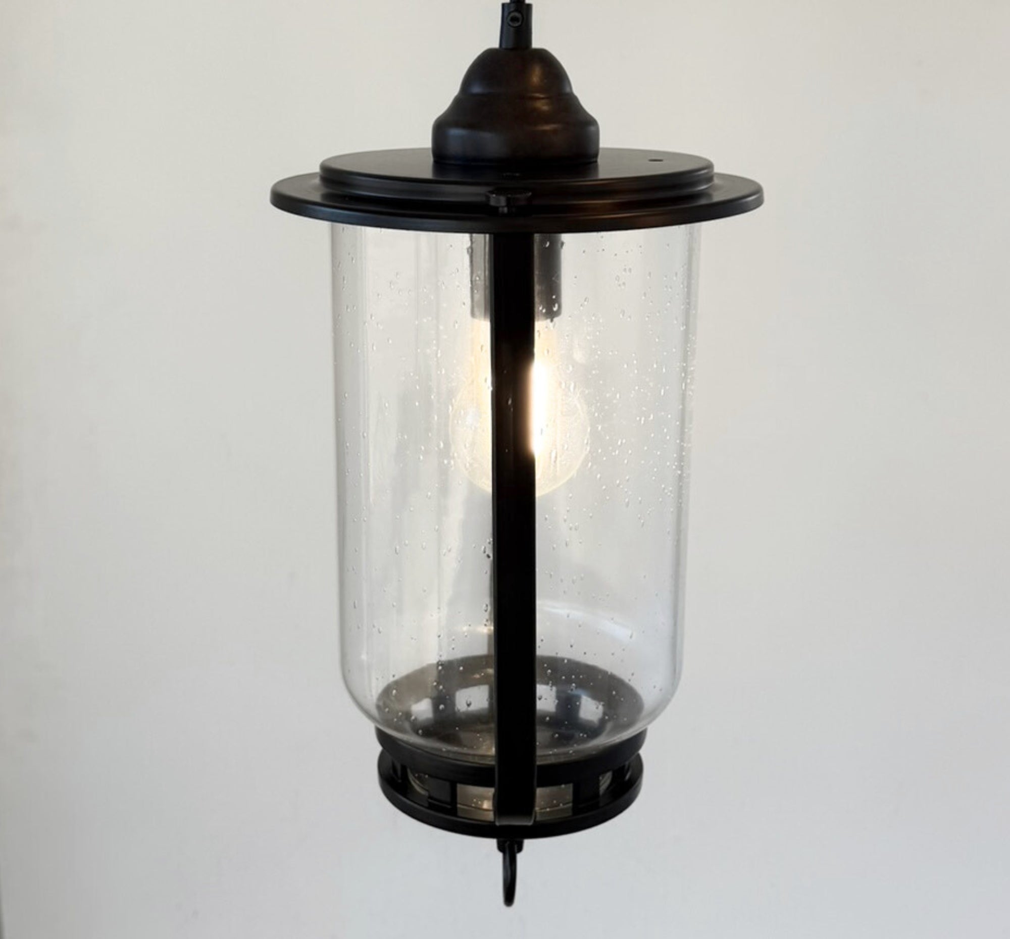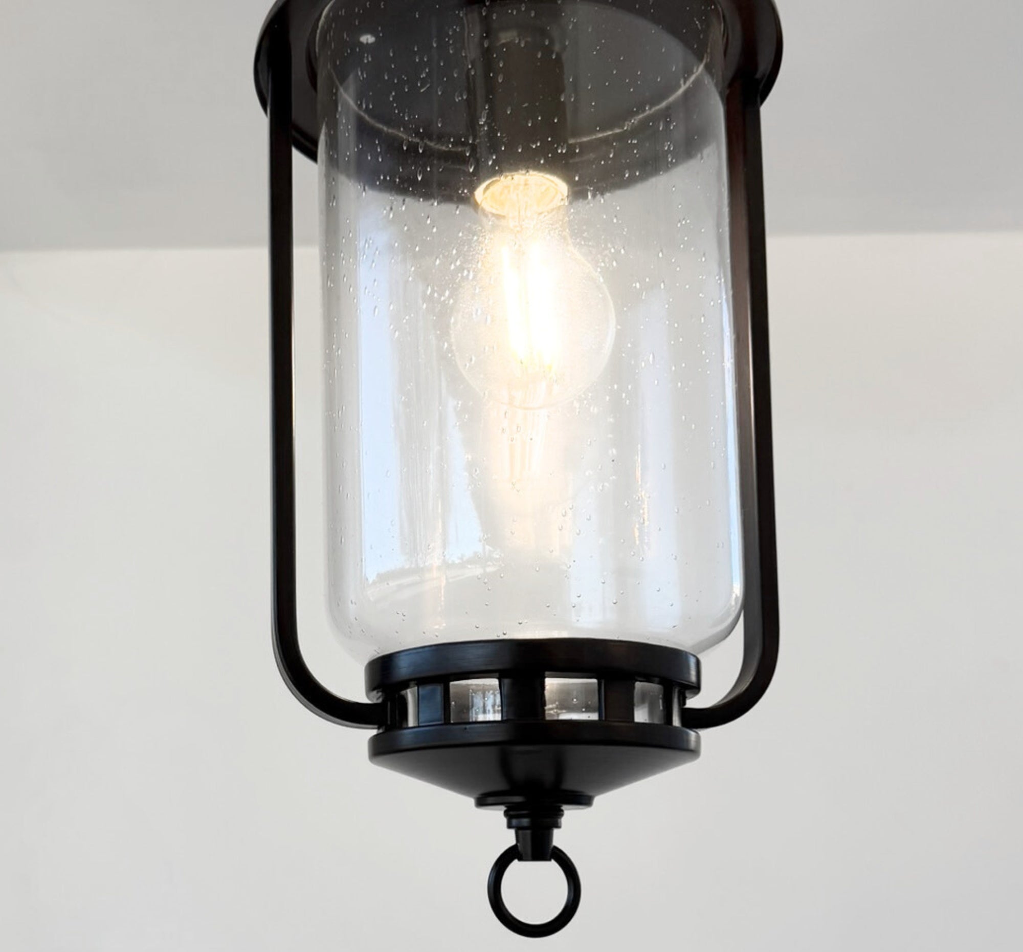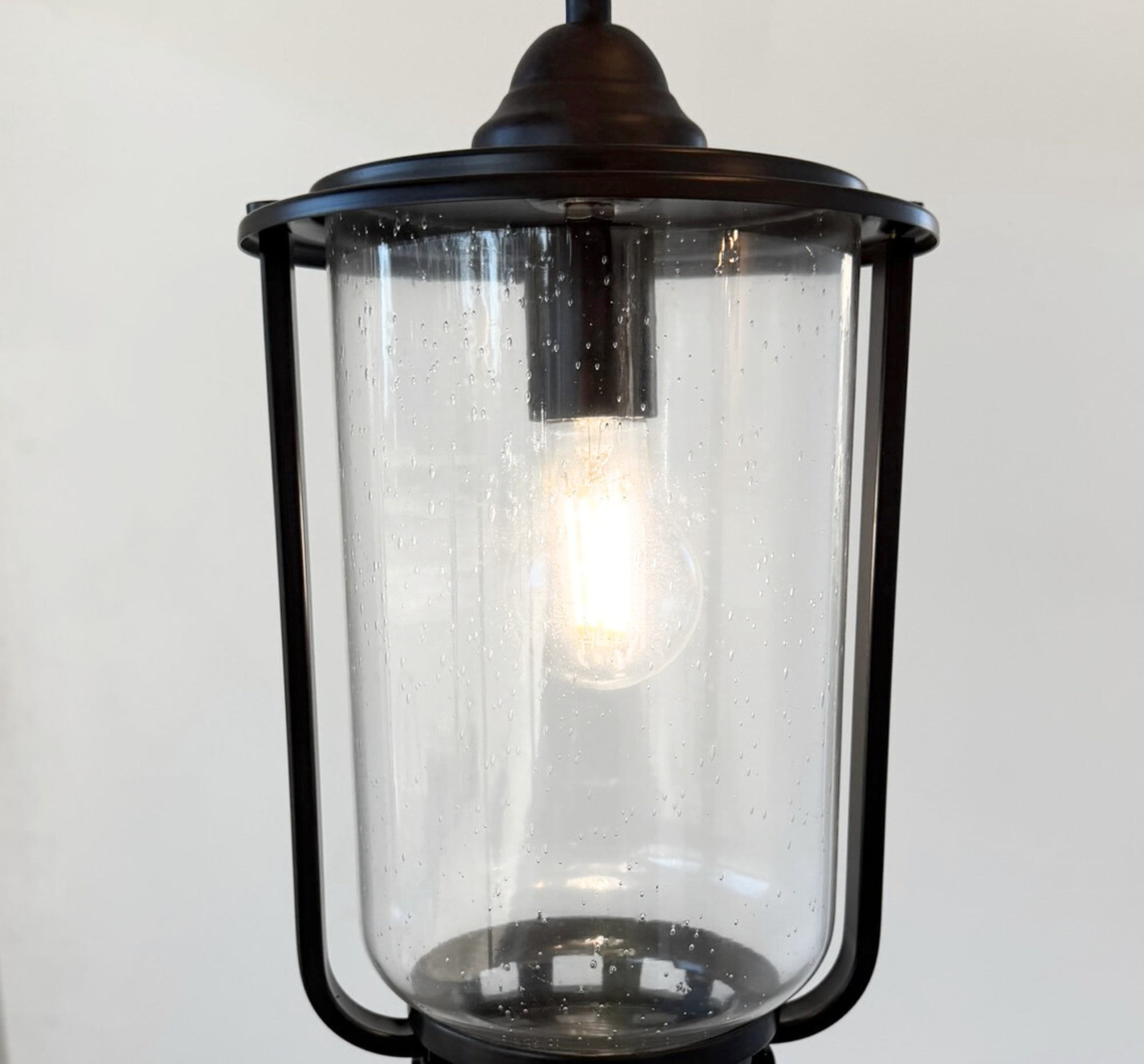 Bring timeless farmhouse charm into your home with this seeded glass lantern pendant light, designed to add warmth, character, and classic appeal to any space. Featuring a black metal frame and clear seeded glass panels, this lantern pendant casts a soft, inviting glow that feels both rustic and refined.