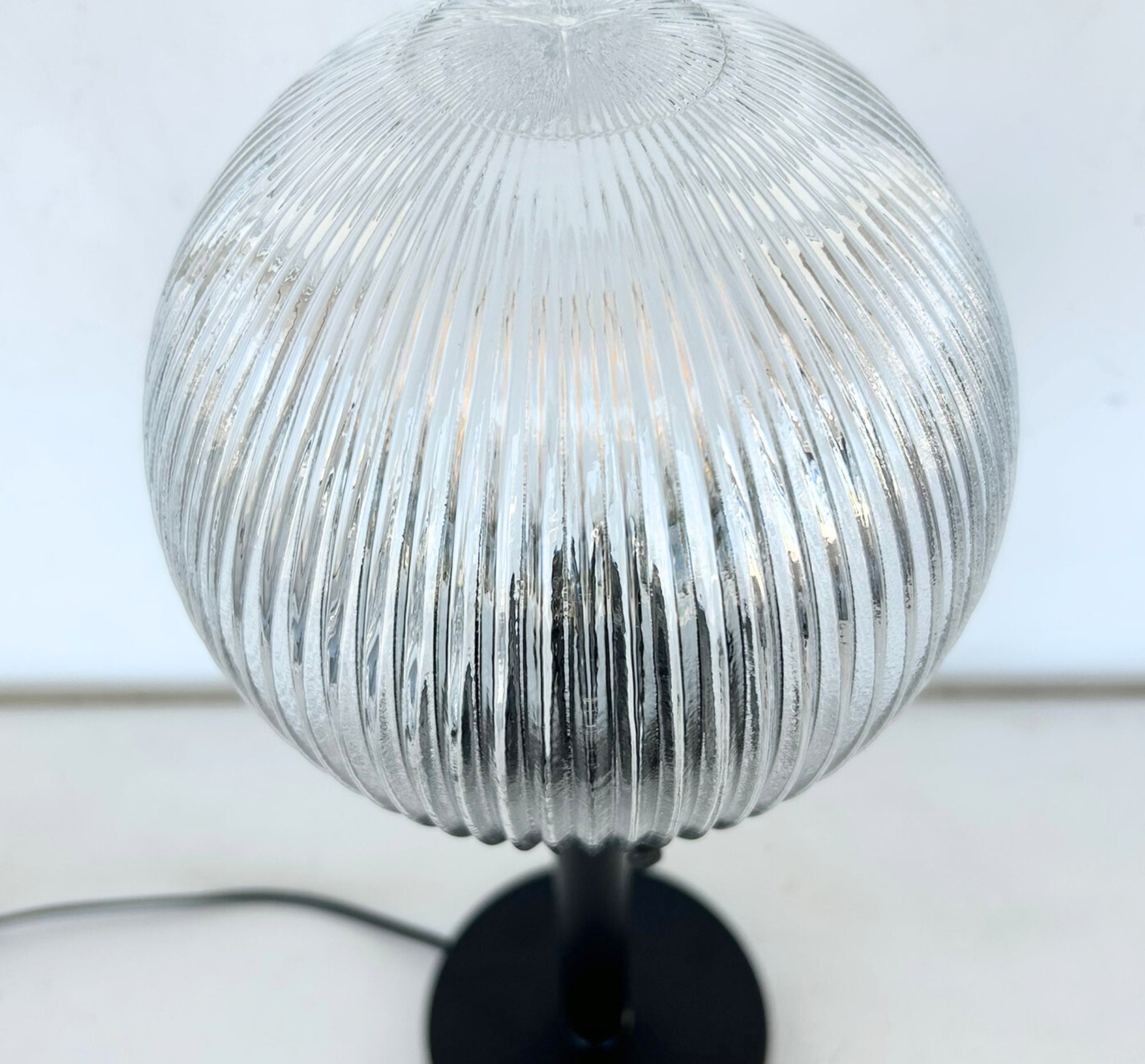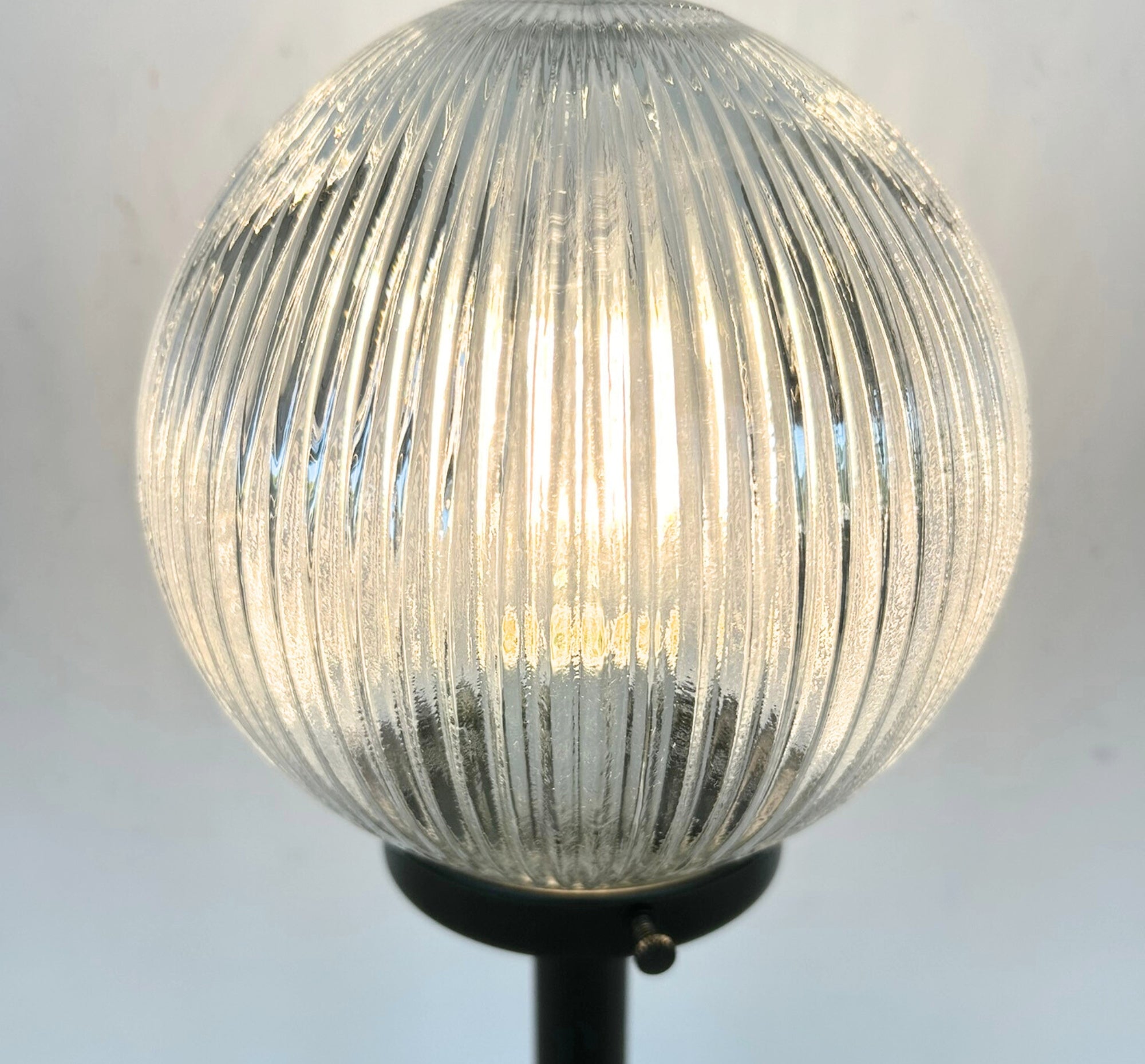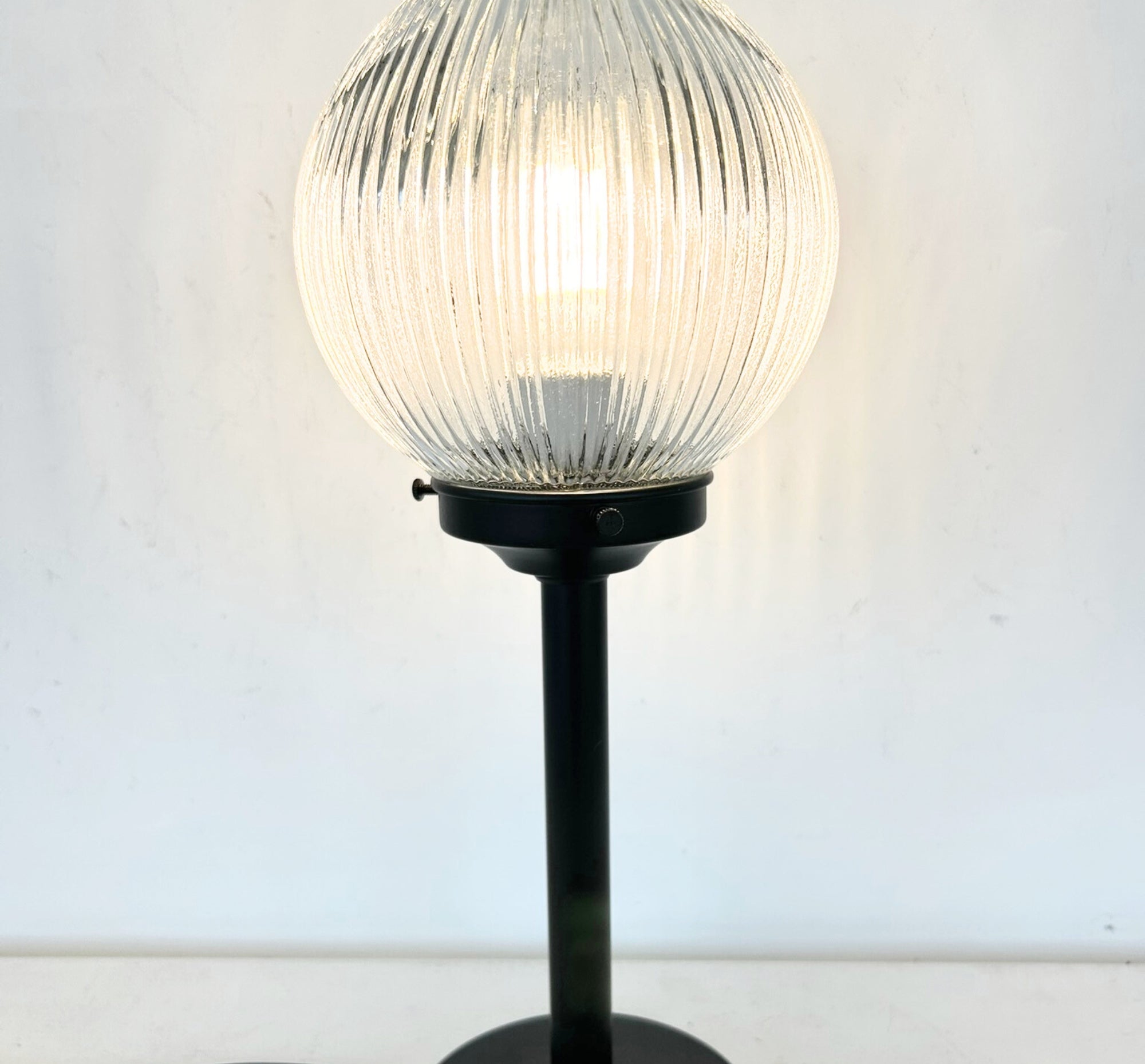 The Farmhouse Holophane Globe Table Lamp features a beautifully textured glass globe inspired by classic Holophane designs, known for their ability to diffuse light evenly while creating a soft, radiant glow. The detailed ribbed and patterned glass adds visual interest, casting subtle light patterns that bring warmth and character to any space.