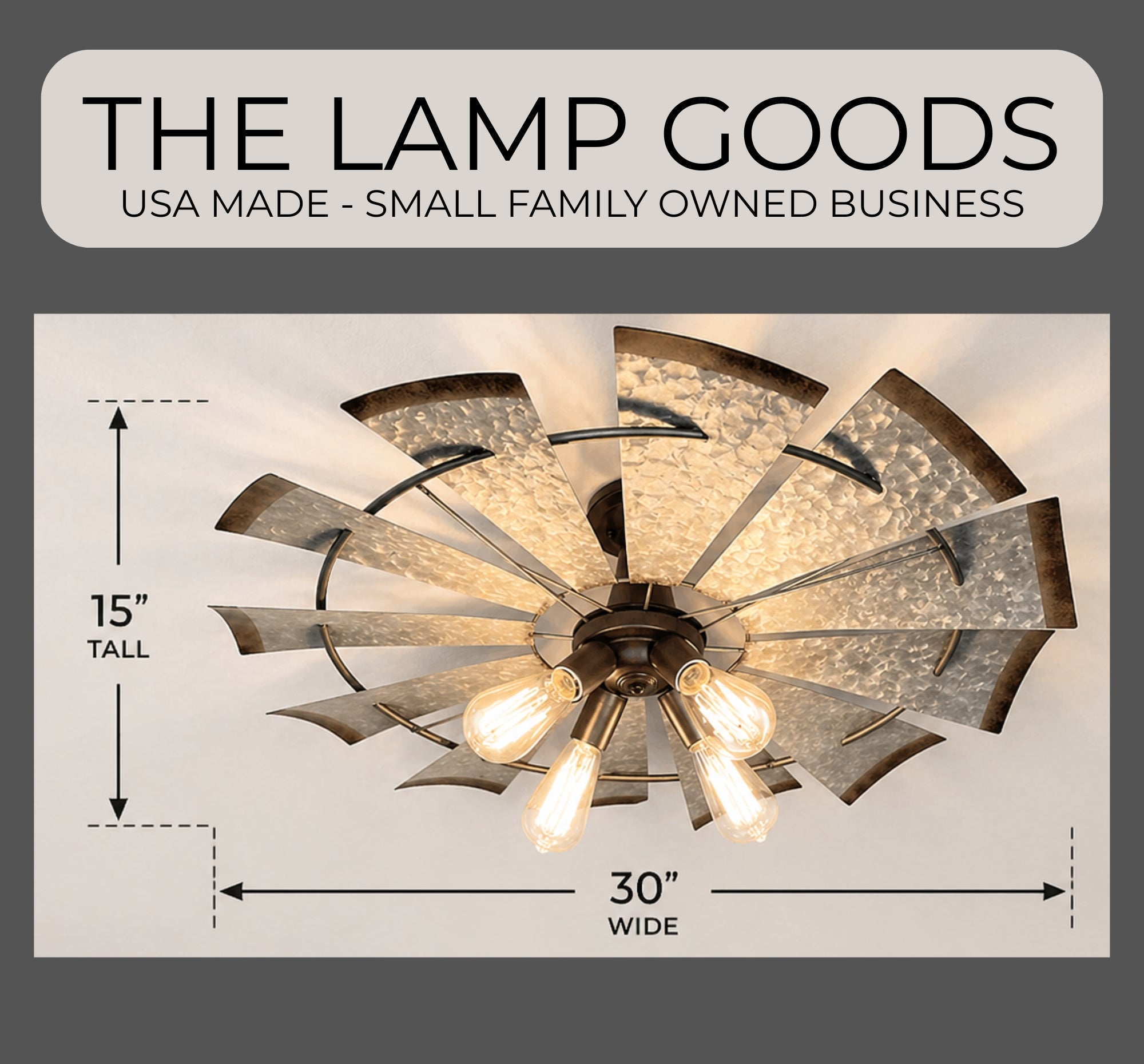 Add a bold statement piece to your space with this Farmhouse Windmill Ceiling Light, designed to bring rustic charm and industrial character into any room. Inspired by classic windmill blades, this stationary design features beautifully curved galvanized metal panels that reflect light outward, creating a warm, eye-catching glow.