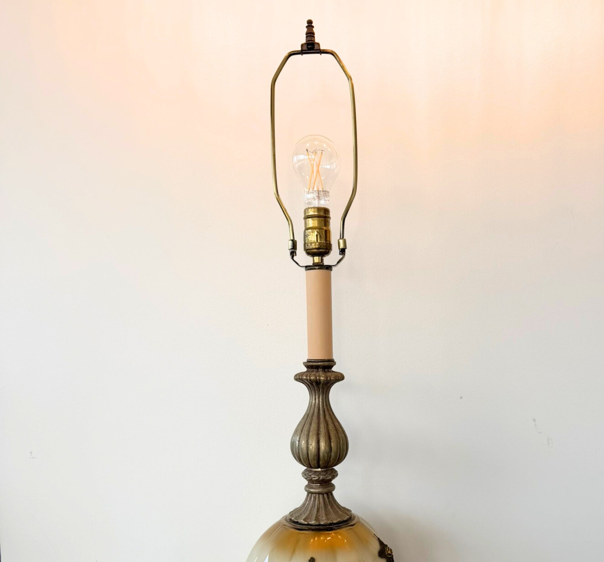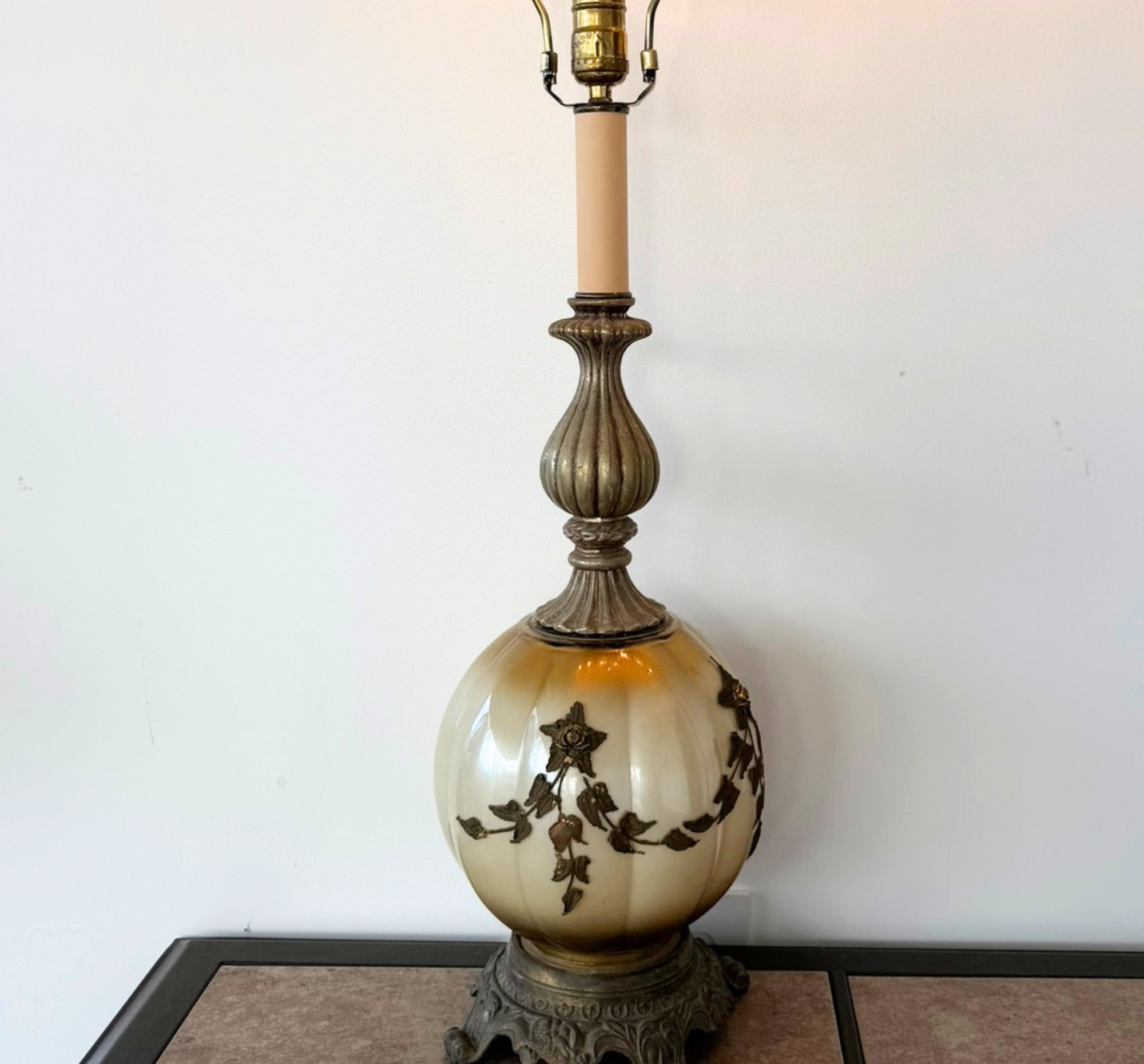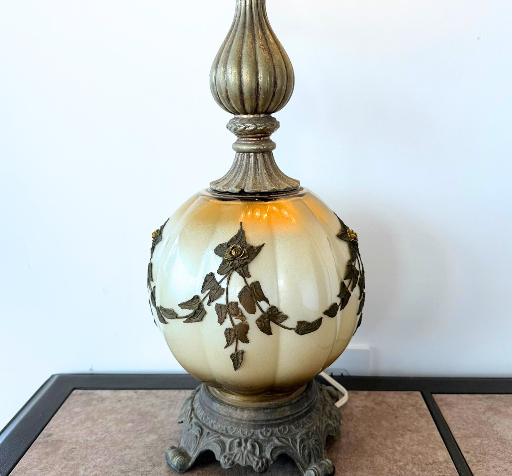 This striking Frankenstein Mid Century Victorian Brass Ivy Overlay Globe Table Lamp is a one-of-a-kind statement piece that blends multiple design eras into a truly unique work of functional art. Featuring a softly glowing frosted glass globe, the lamp is adorned with an intricate brass ivy overlay that wraps organically around the globe, adding depth, texture, and old-world character.