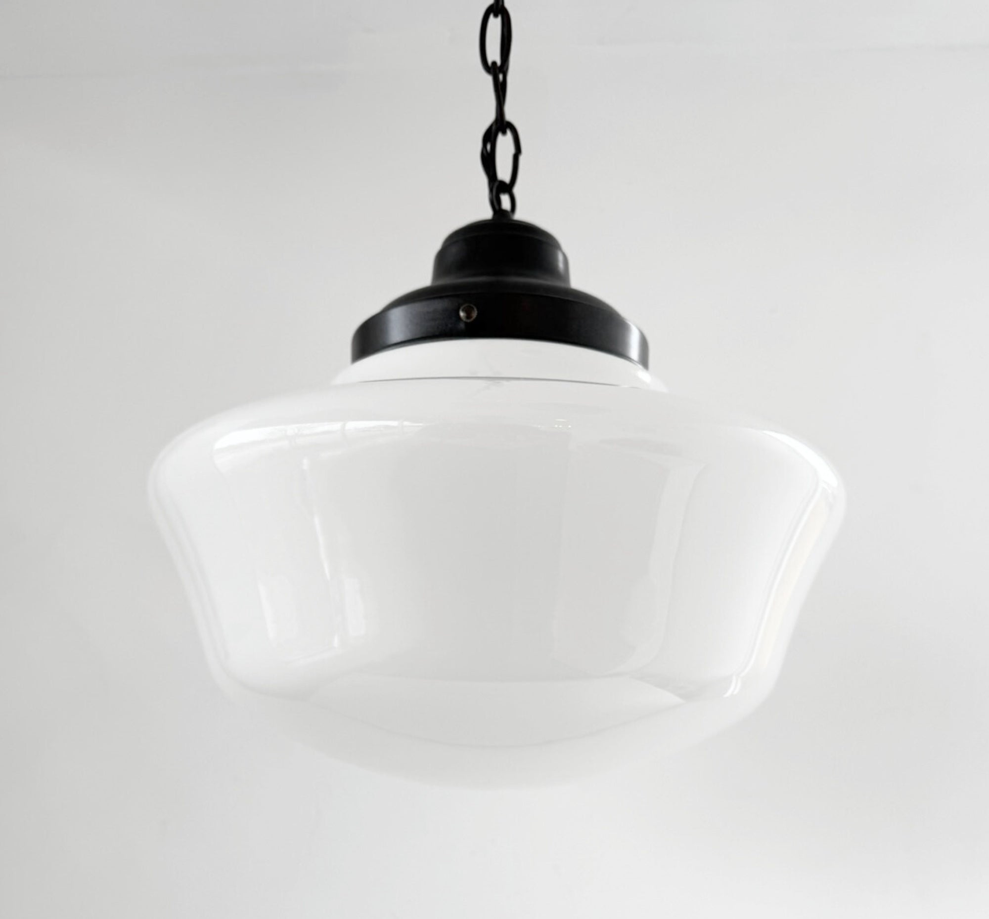 Originally installed throughout the school, these shades later remained in place when the property was purchased by the Statler Brothers Gospel Group and used as their headquarters. Roughly 20 years ago, during a major renovation under Grace Christian School’s ownership, the shades were removed and thoughtfully stored in the building’s attic—where they remained preserved until recently rediscovered during preparations to sell the historic property. The glass shades are original milk glass schoolhouse globes, not reproductions. Each piece carries subtle character marks consistent with age, making every shade unique.