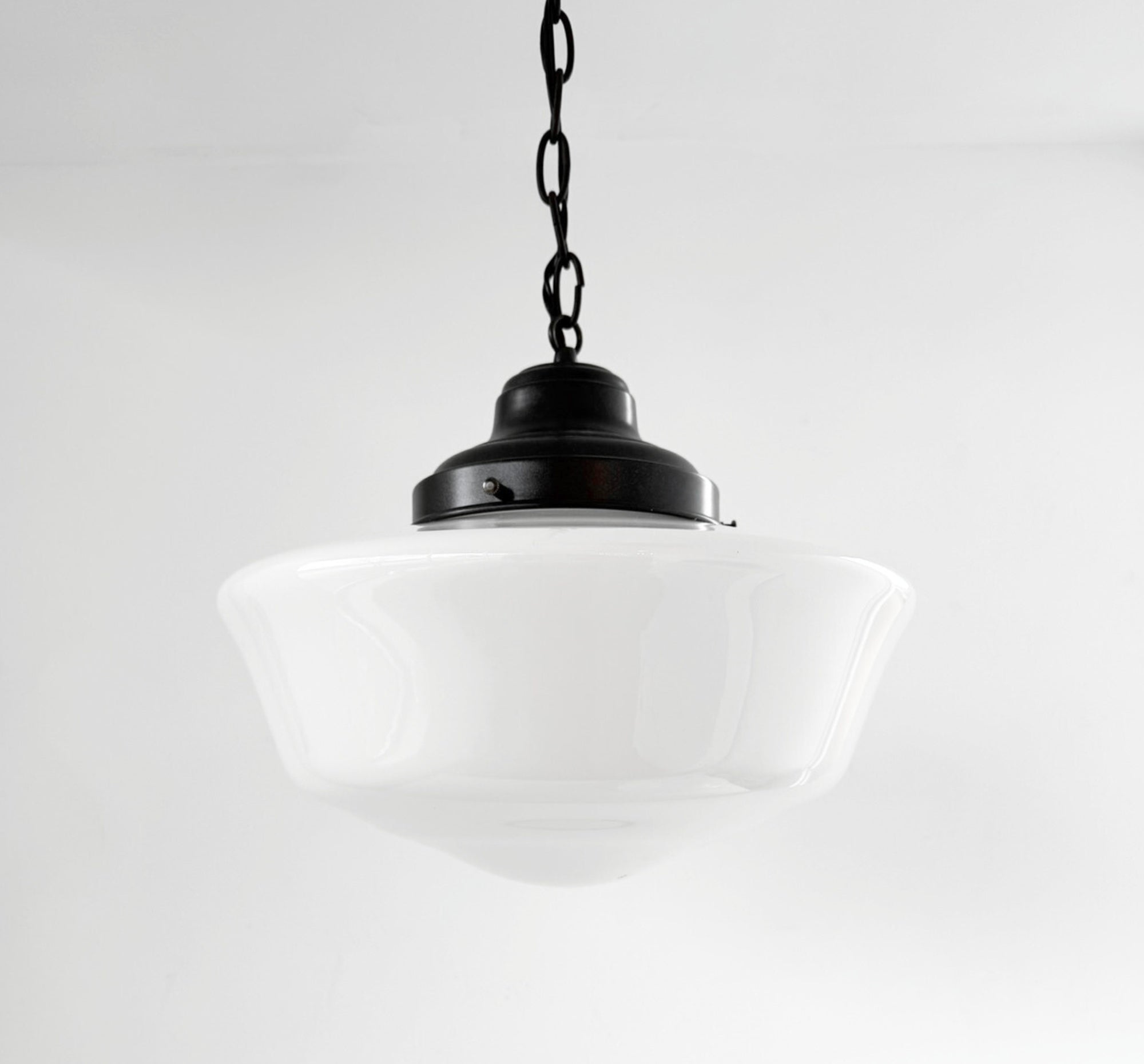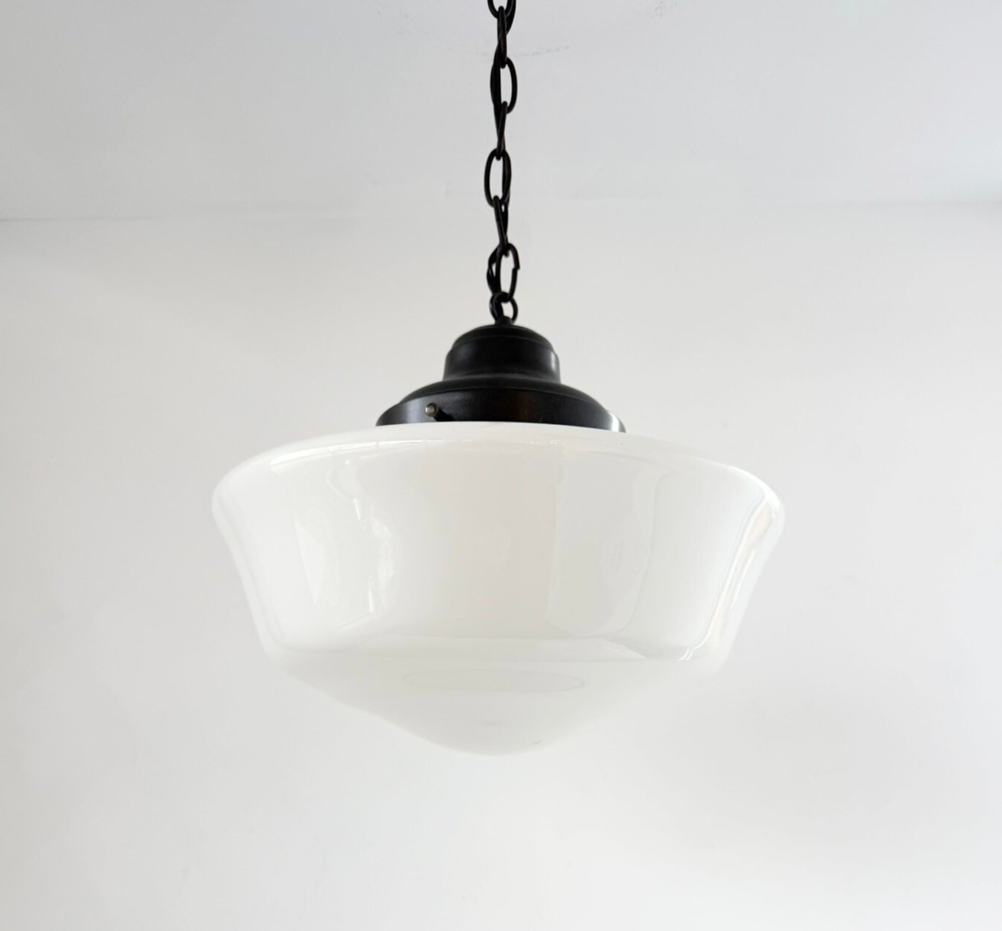 Originally installed throughout the school, these shades later remained in place when the property was purchased by the Statler Brothers Gospel Group and used as their headquarters. Roughly 20 years ago, during a major renovation under Grace Christian School’s ownership, the shades were removed and thoughtfully stored in the building’s attic—where they remained preserved until recently rediscovered during preparations to sell the historic property. The glass shades are original milk glass schoolhouse globes, not reproductions. Each piece carries subtle character marks consistent with age, making every shade unique.