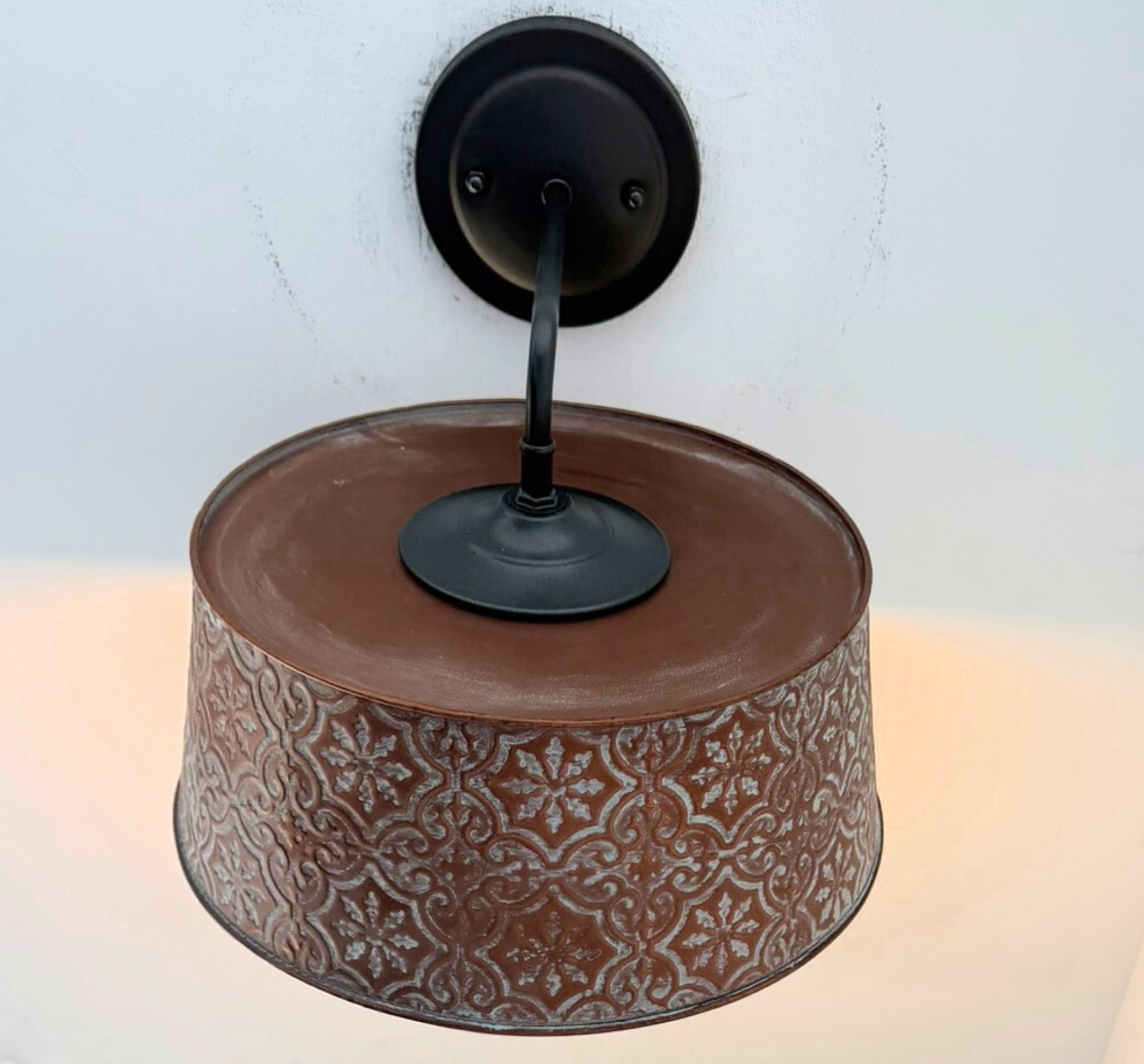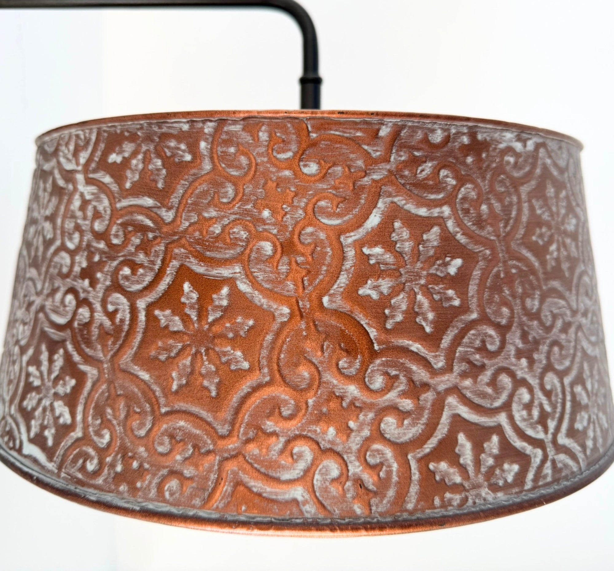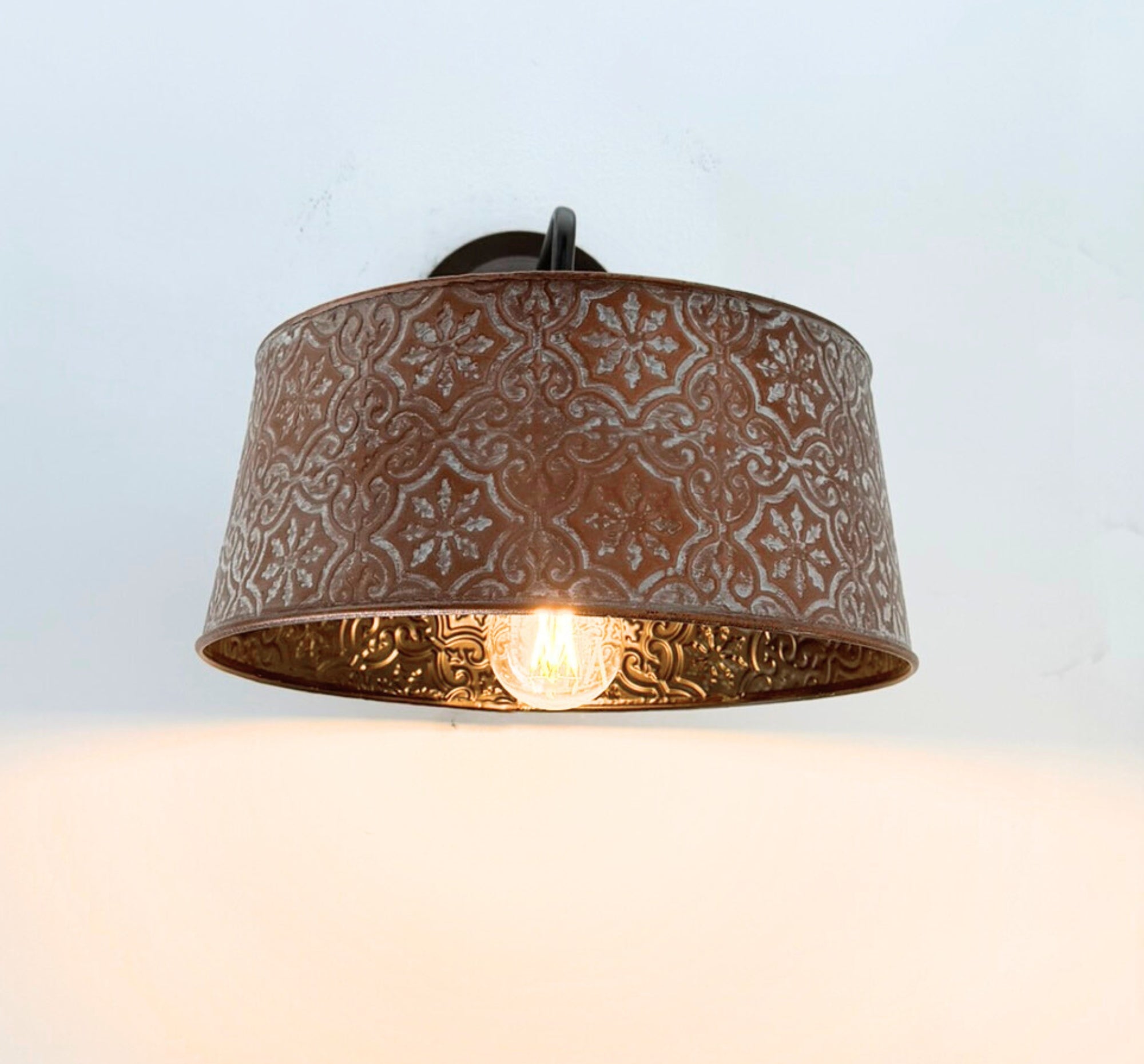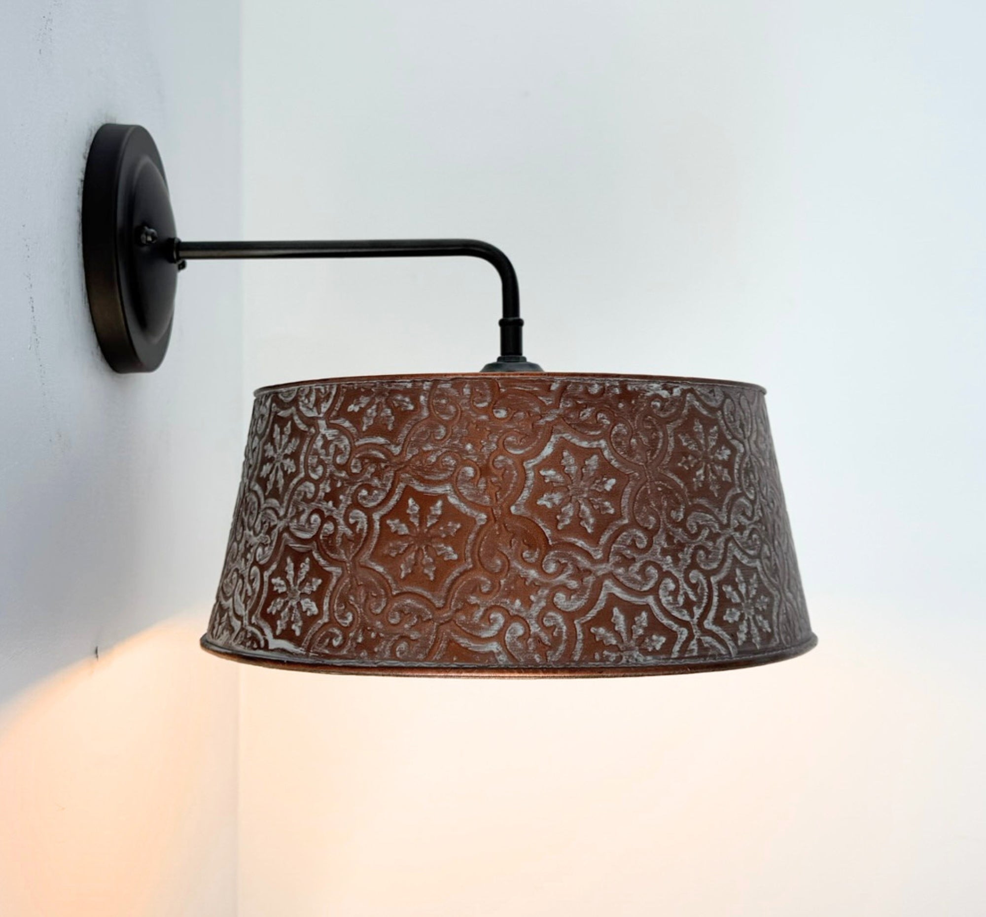Per a custom request, we've updated our popular Ornate Copper Wall Sconce with a new 90 degree arm. Made for those who do not like gooseneck arms, this linear style will add warmth and timeless character to your home. Featuring a richly textured copper color shade with a soft, patina tinted finish, this wall light brings a cozy glow and artisan feel to any space.