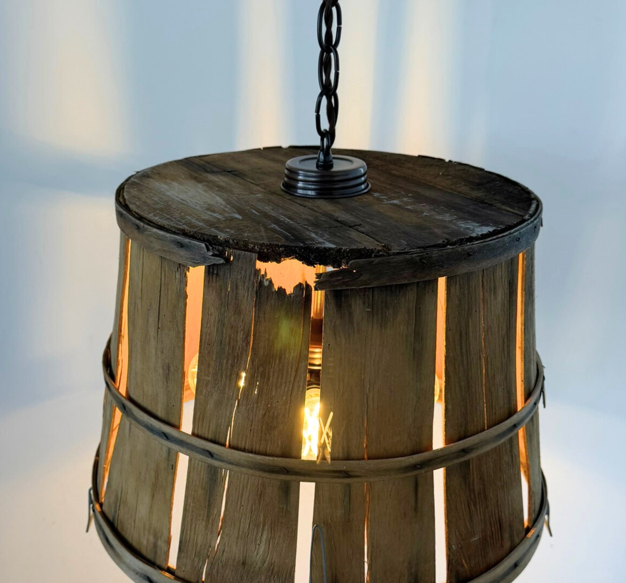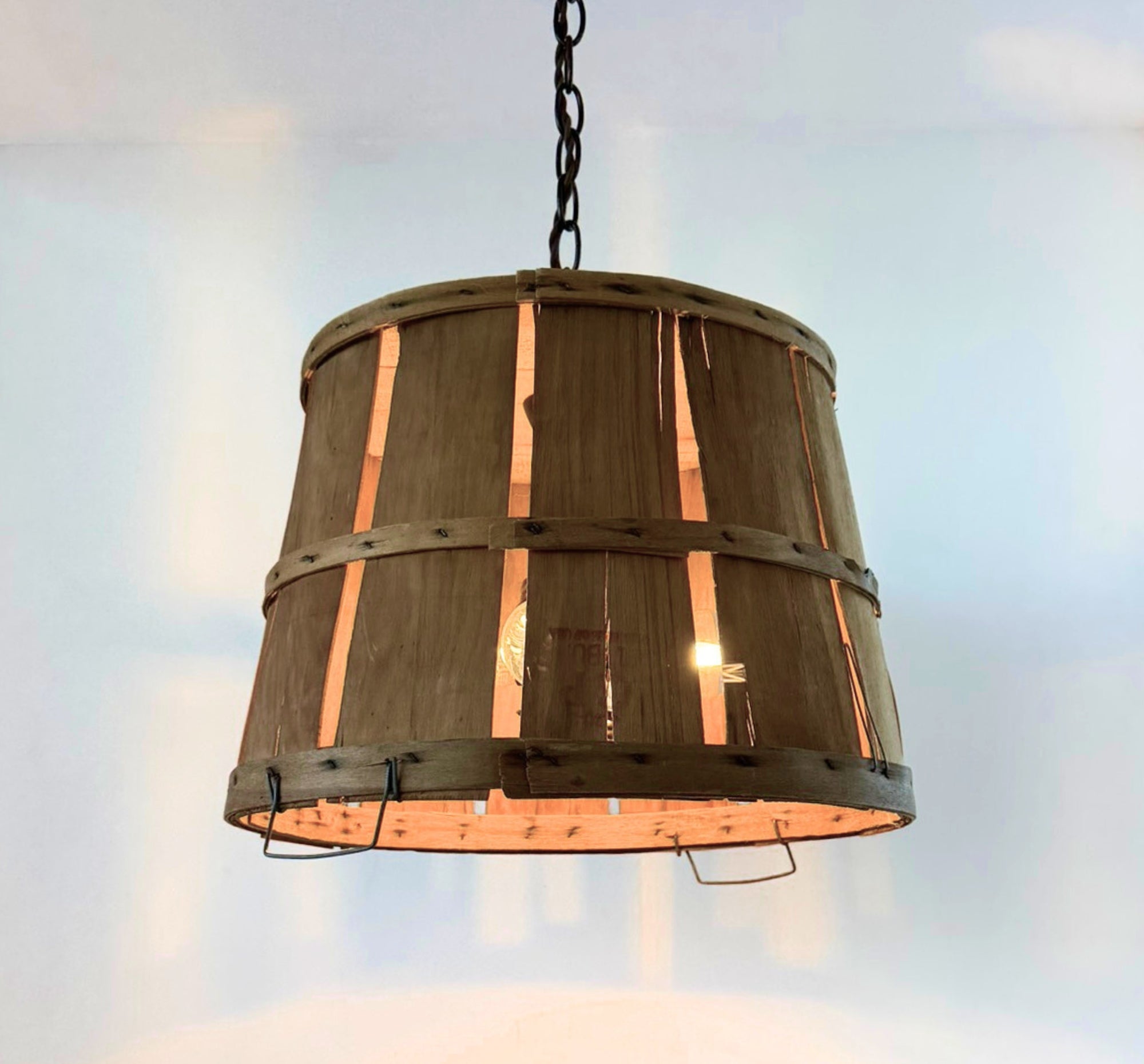 Bring authentic farmhouse heritage into your home with this Salvaged Orchard Basket Pendant Light, crafted from a vintage-style wooden harvest basket. Once inspired by the hardworking baskets used in orchards and fields, this piece now serves as a warm, statement lighting fixture full of texture and story. TWO AVAILABLE! SEE LISTING PICTURES FOR SLIGHT DIFFERENCES BETWEEN THEM!