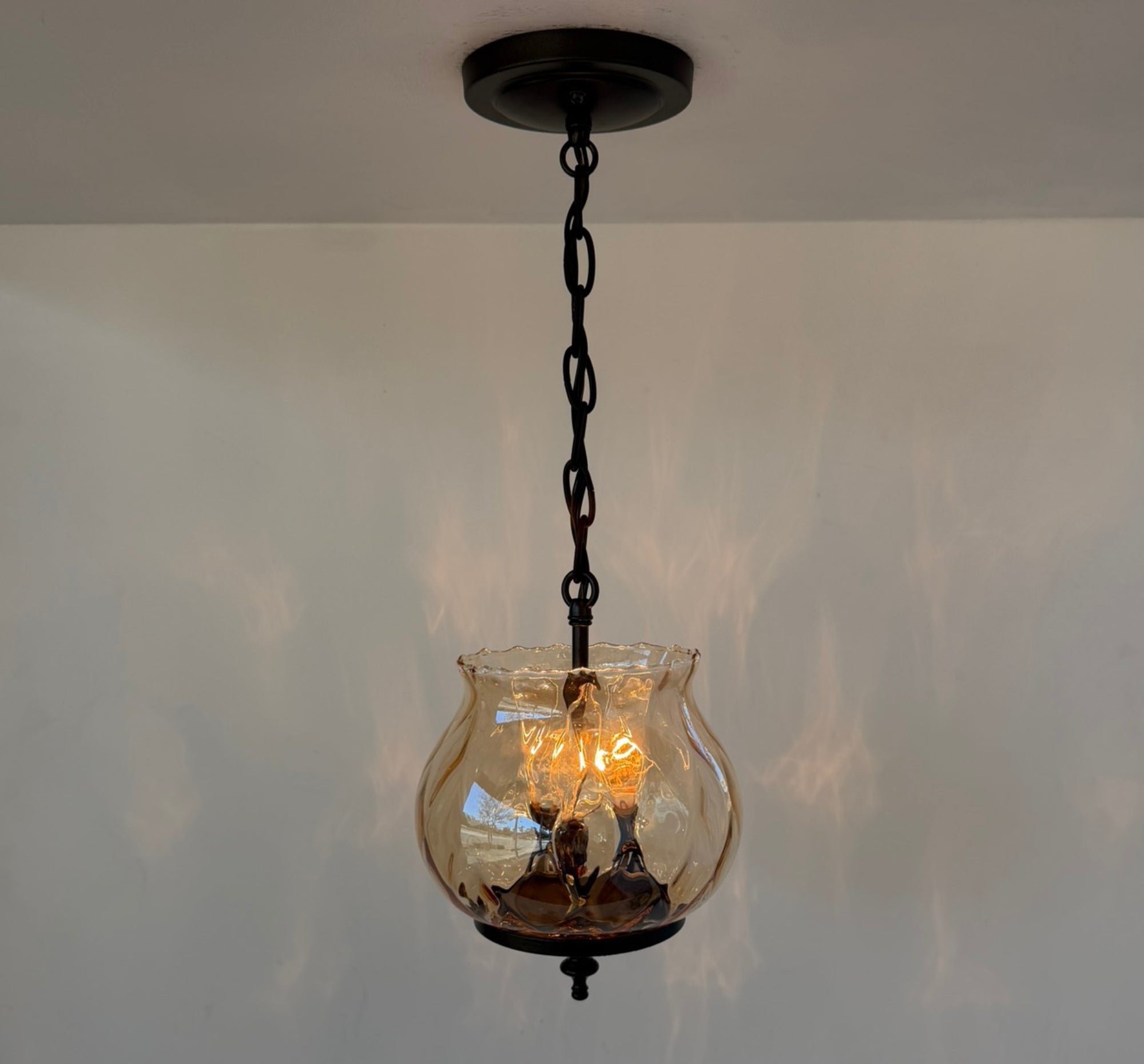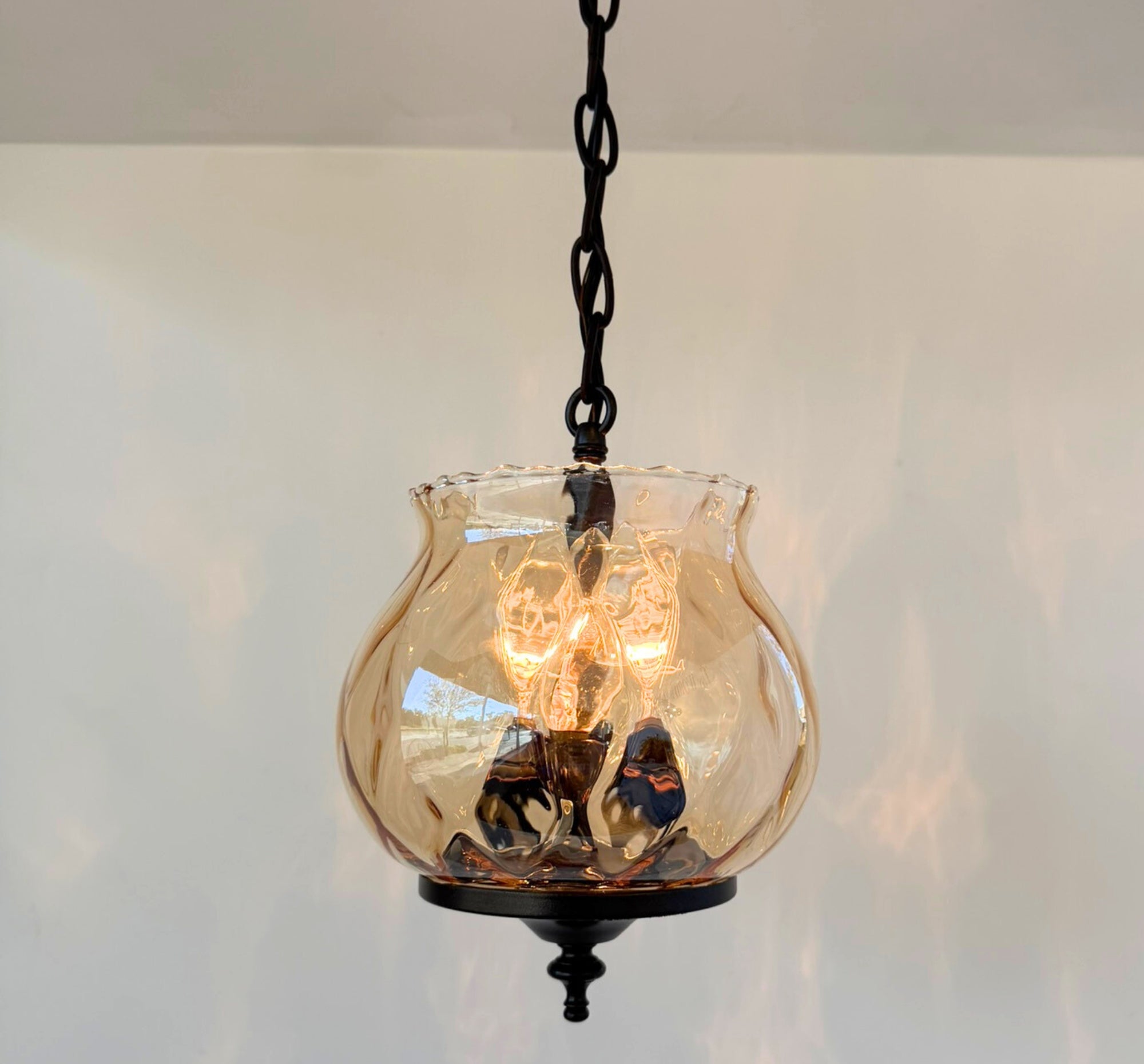 This Vintage Amber Glass Tulip Pendant Light features a beautifully shaped, hand-blown glass shade with soft ruffled edges and a rich amber tone that casts a warm, inviting glow. The tulip-inspired silhouette adds graceful movement and vintage charm, while the glowing amber glass creates a cozy, atmospheric light reminiscent of early farmhouse and cottage interiors. The way light refracts from this antique glass is GORGEOUS!