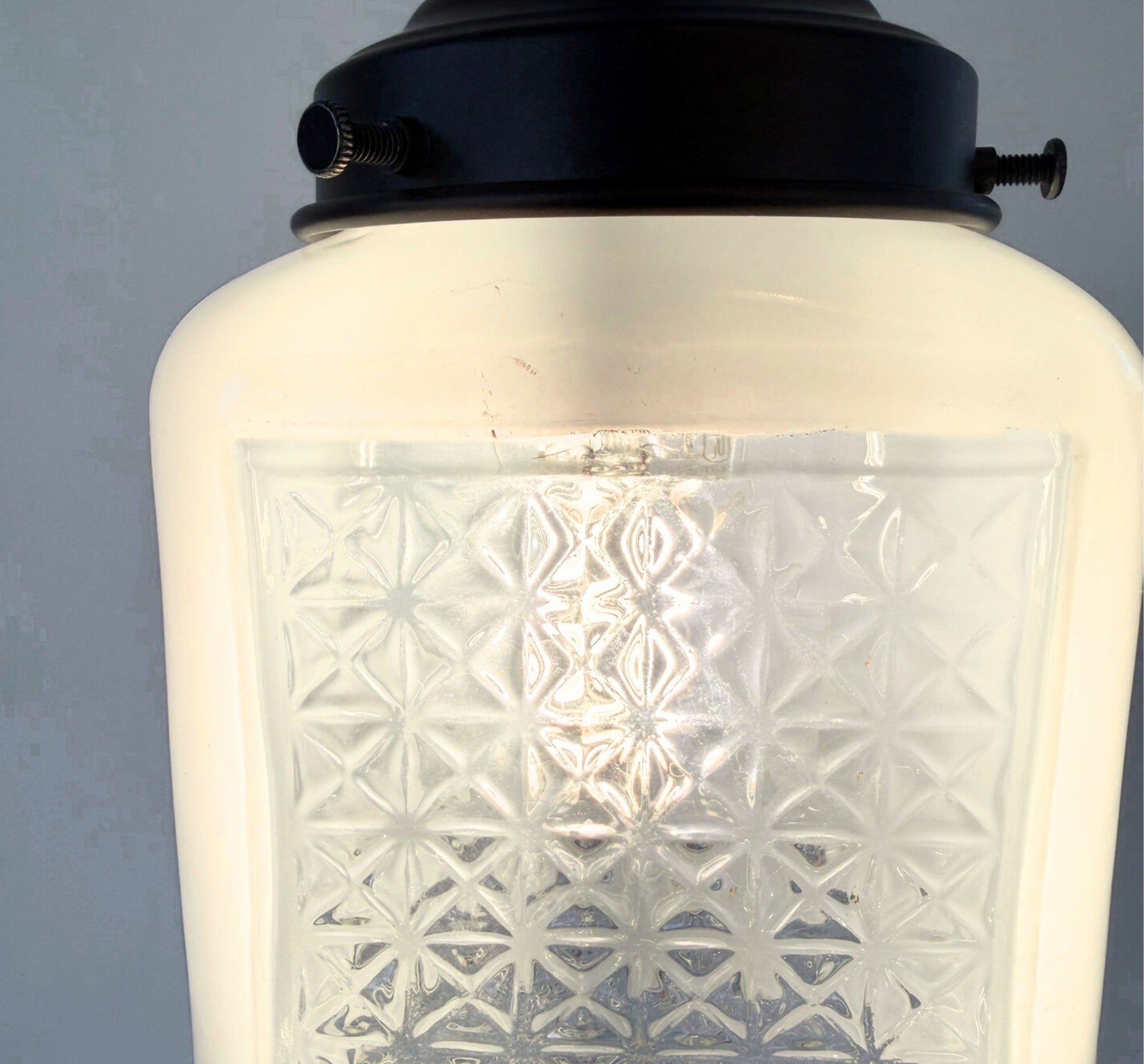 Bring nostalgic charm and handcrafted beauty into your home with this Vintage Diamond-Pattern Square Glass Pendant Light. Featuring a stunning textured diamond design pressed into clear glass, this pendant glows beautifully when lit—adding warmth, sparkle, and character to any farmhouse, cottage, or vintage-inspired space.