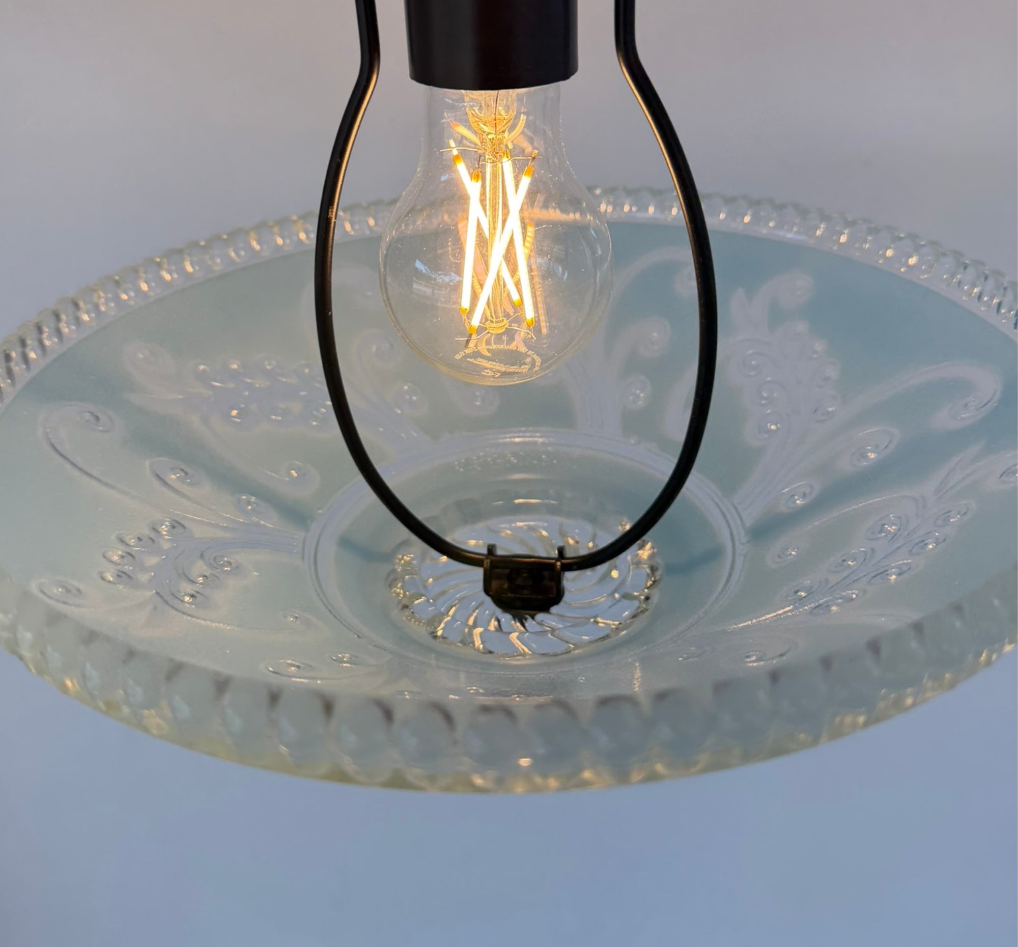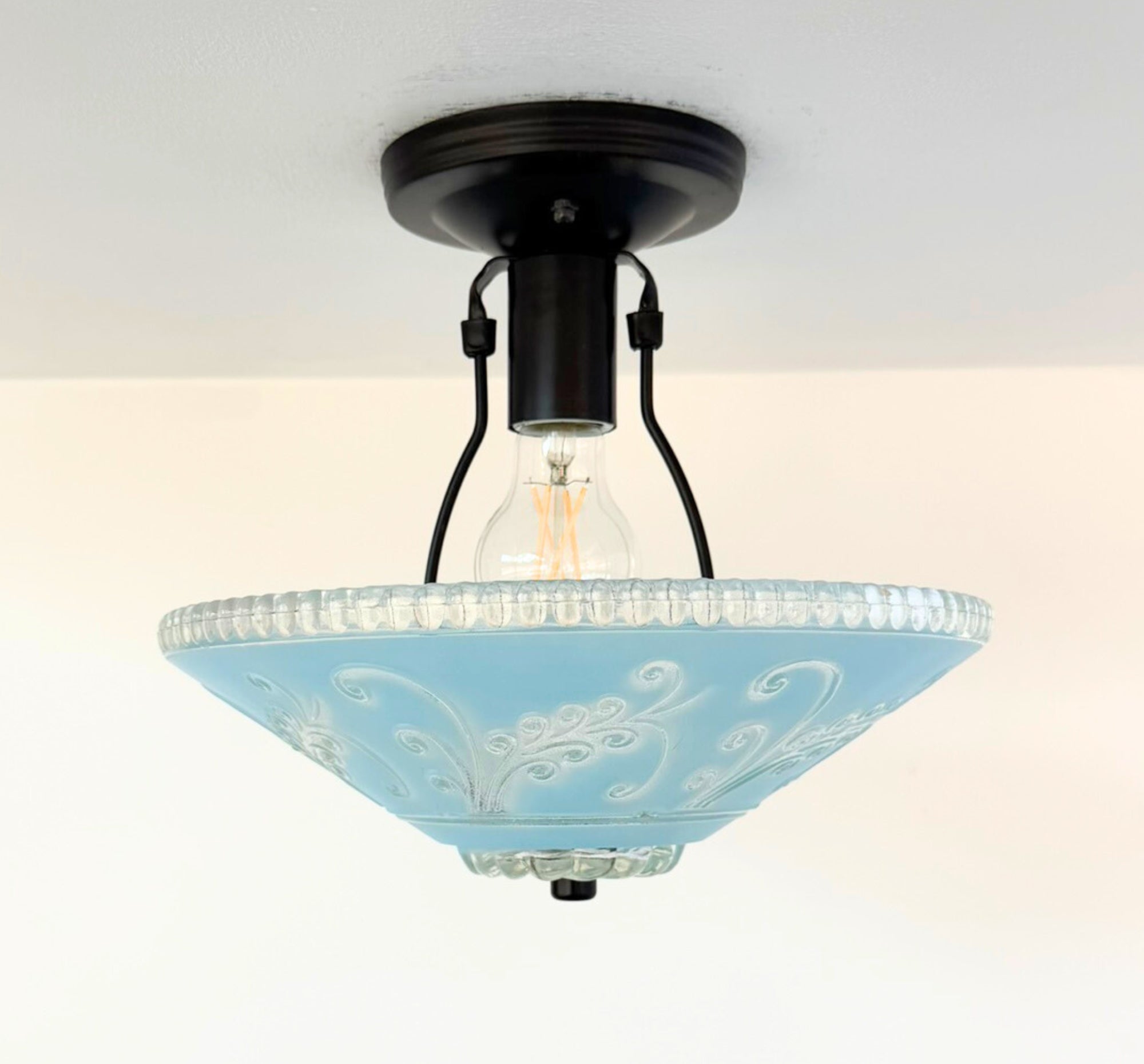 Soft, elegant, and full of timeless charm, the Vintage Frosted Floral Scroll Glass Ceiling Light is a beautiful lighting choice for spaces that call for warmth and serenity. The delicately frosted glass features graceful floral scroll detailing that diffuses light gently, creating a soothing glow—perfect for a nursery, child’s room, or any cozy space in the home.