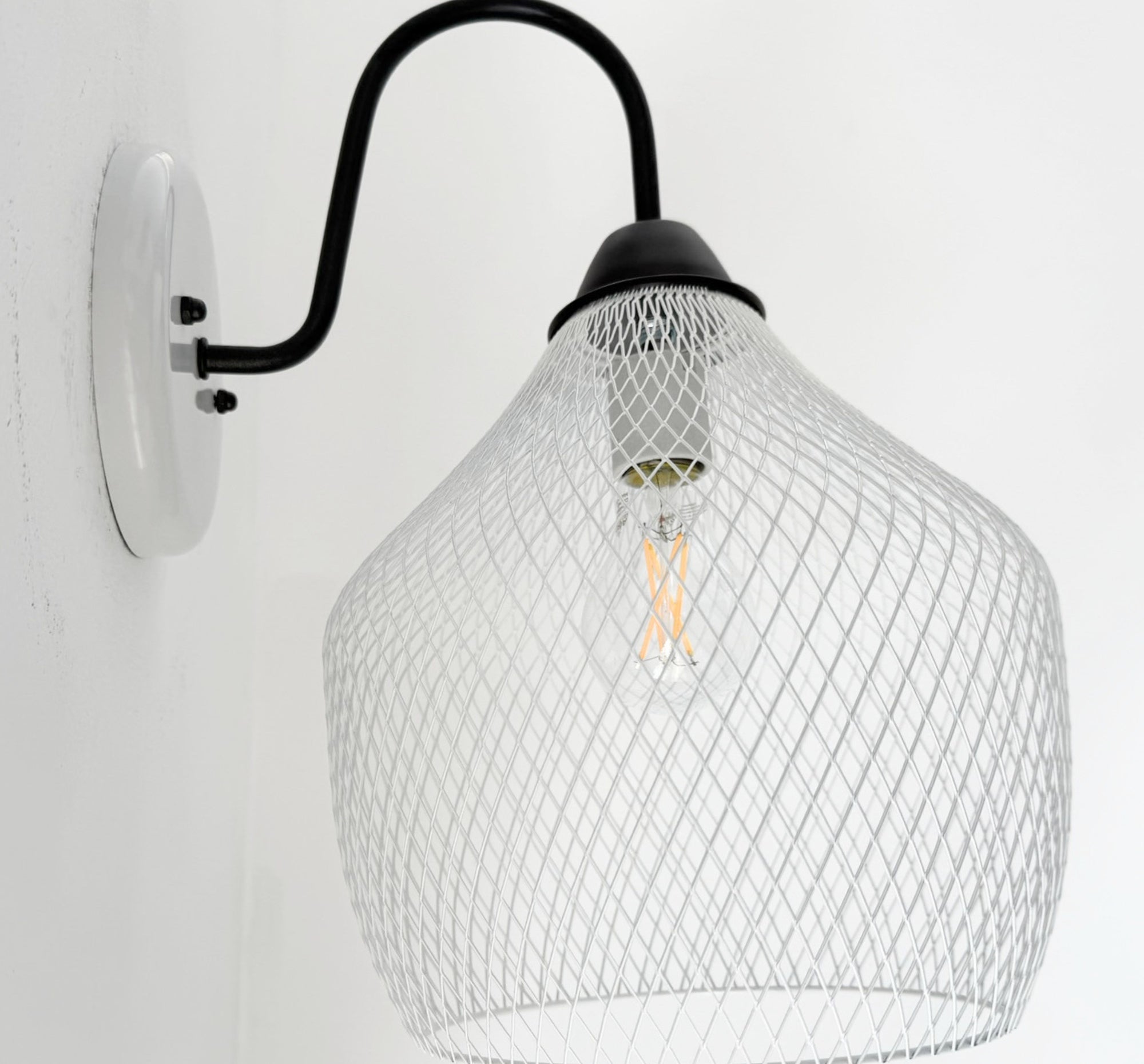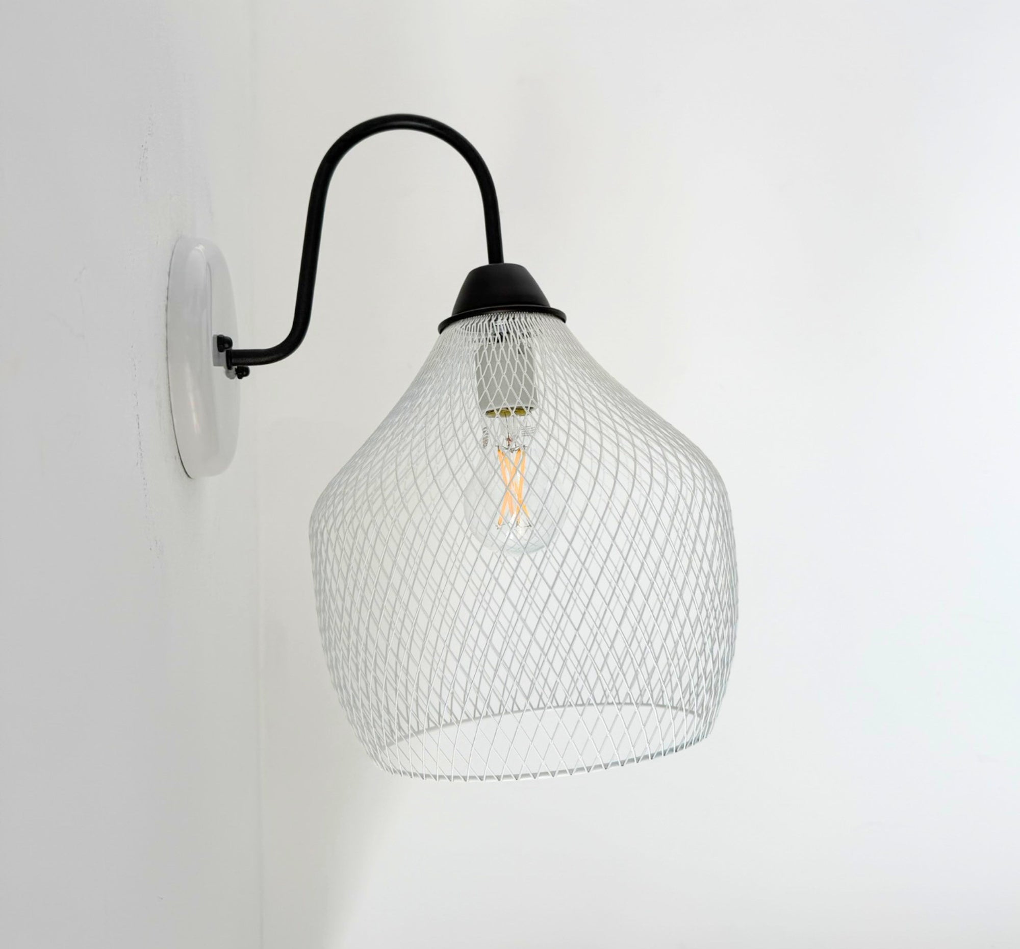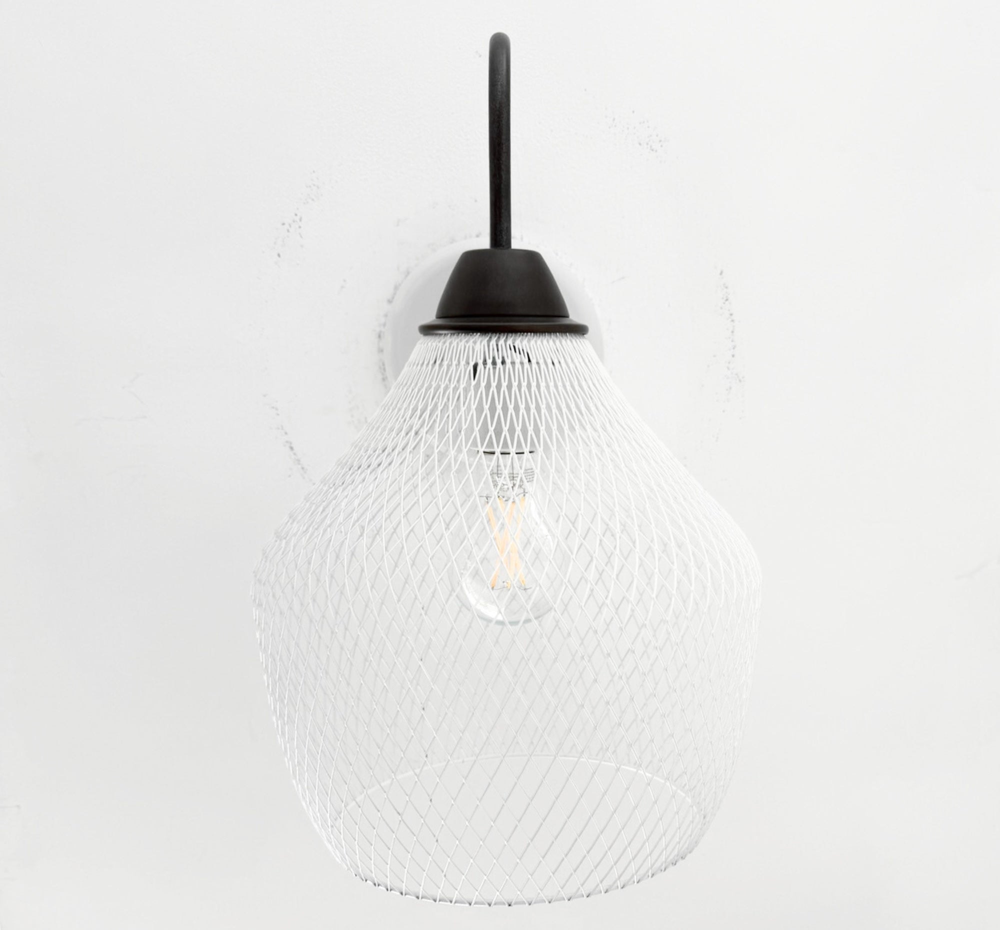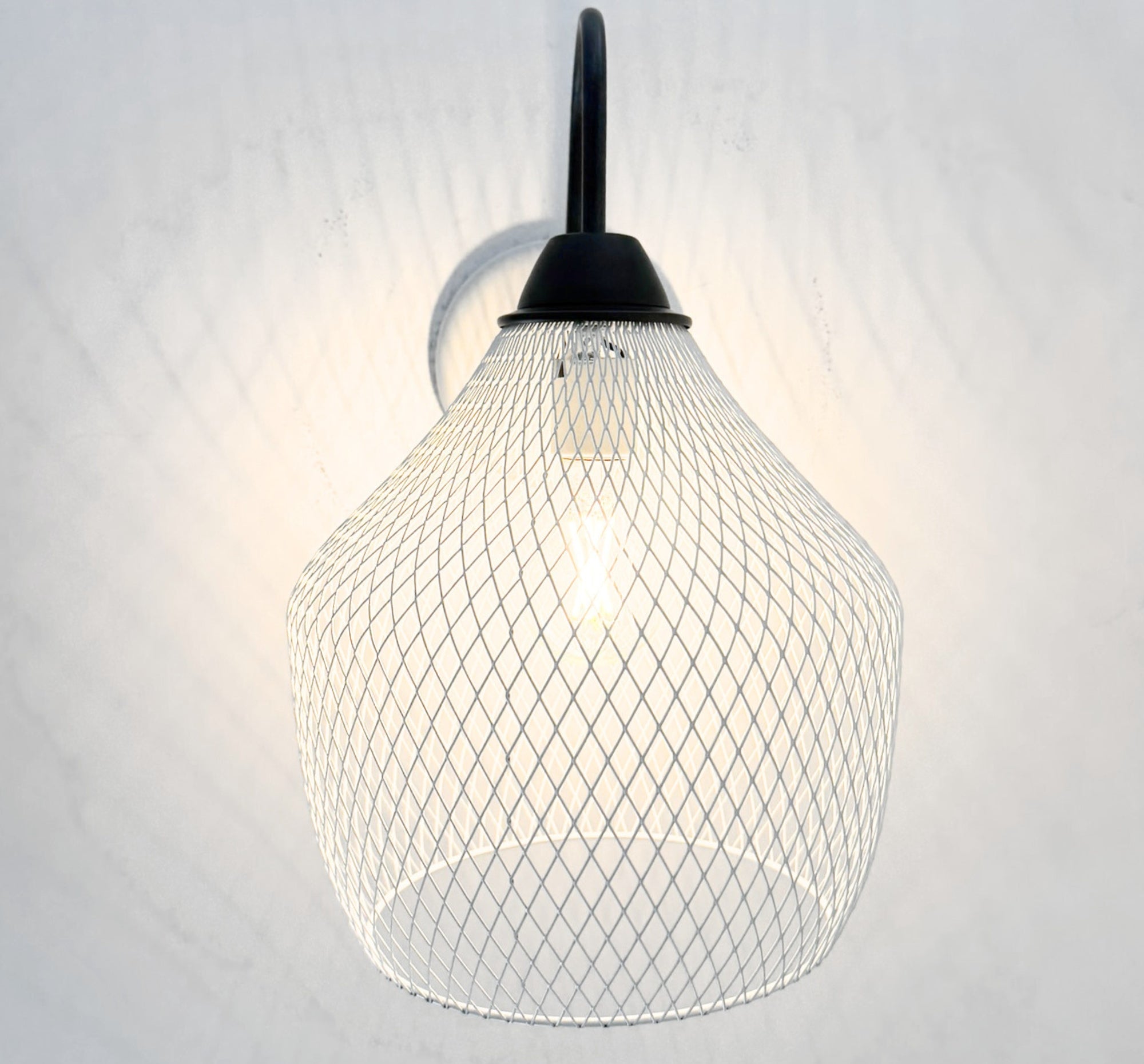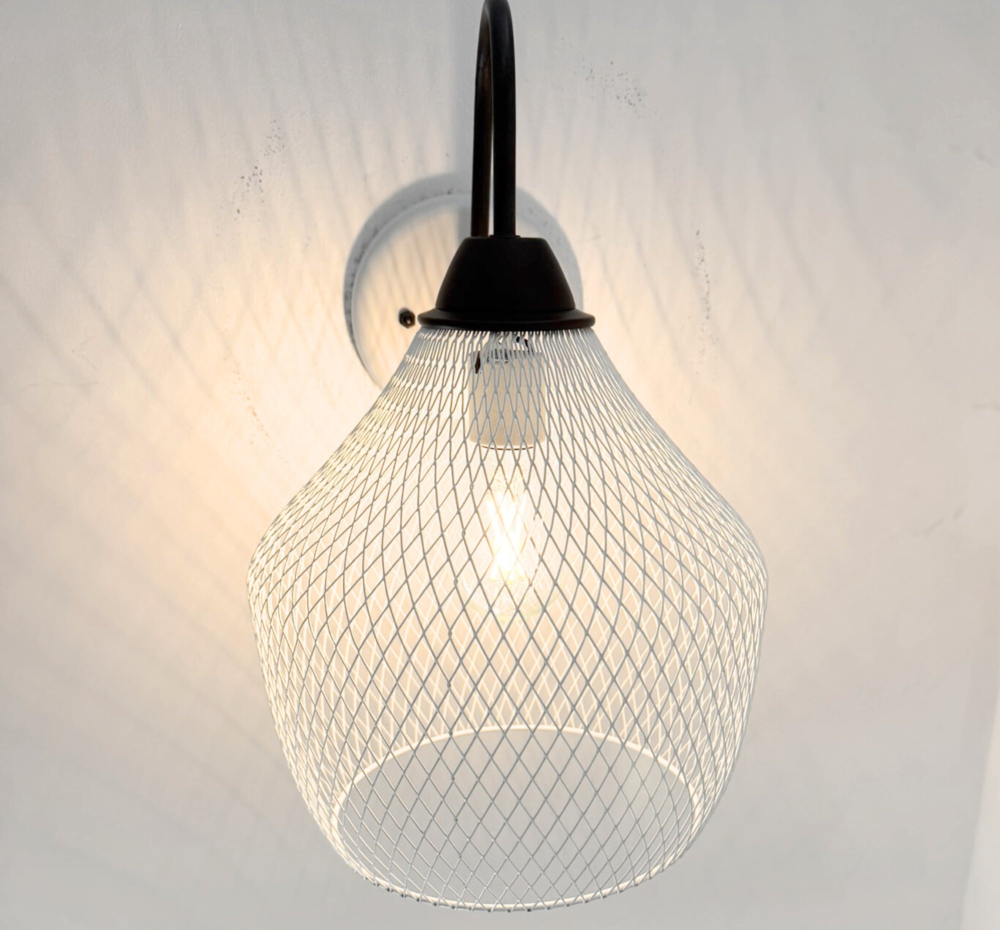 Bring warm character and industrial charm to your space with our Farmstead Wire Lantern Wall Sconce. Designed with a gracefully curved gooseneck arm and a hand-finished black metal canopy, this fixture features a sculptural wire mesh lantern shade that casts beautiful patterned light across the wall when illuminated.